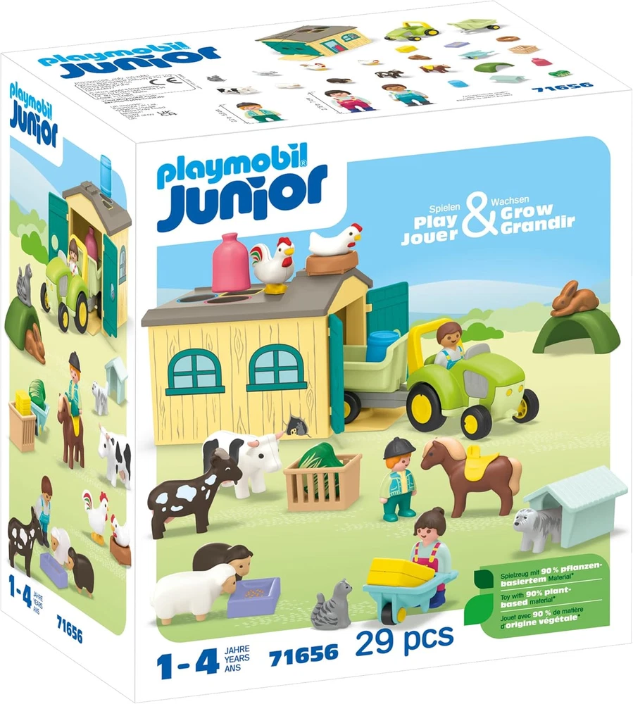 Playmobil Junior: Farm Adventure with Tractor, Trailer, and Animal Friends 71656 Exciting Country Life: With tractor, trailer, and animals, your child can help out on the farm by caring for animals and sorting the feed. Who drives the tractor? Who rides the pony? Encourages the use of motor skills and a child's imagination through interactive play Toy for children ages 1+: The PLAYMOBIL JUNIOR sets are optimally designed for little hands with age-appropriate size, and featuring rounded edges. They come with engaging features for toddler-friendly discoveries Safe play: PLAYMOBIL JUNIOR stands for maximum safety for your child. The sets are manufactured in the EU, BPA-free, and designed without small parts. Everyday use: High quality and robust design, to clean the parts (not including stickers), place pieces under running water Sustainability: The PLAYMOBIL JUNIOR playsets are made from over 90% plant-based plastics. For our packaging, we use at least 90% recycled cardboard as well as 100% recycled paper and avoid plastic wherever possible Contents: 29 pieces with instructions: 3 figures, 10 animals, 16 additional accessories; materials made from plastic; LxWxH: 11.2 x 9.7 x 6.3 inches Get ready for some hustle and bustle! The animals at the Animal Home are hungry and need to be taken care of. Here, little animal lovers can take care of their favorite pets. The four pets need to be fed and given places to sleep. Inside the roof you will find a treat dispenser. Here, children learn about the animals' favorite foods and have a blast watching the food zip through the machine. Now, there's just one question left: Who's the hungriest? Set includes two figures, wheelbarrow, rabbit, horse, cat, dog, and other accessories. PLAYMOBIL JUNIOR - designed for our youngest PLAYMOBIL fans! Perfect for small hands and early toddler-friendly discoveries. With many exciting features such as stacking, puzzling, or sorting fun. Let your child aged 1-4 years take their first steps into the big PLAYMOBIL world with PLAYMOBIL JUNIOR! PLAYMOBIL JUNIOR keeps your child’s safety in mind: PLAYMOBIL JUNIOR is manufactured in the EU, BPA-free and designed without small parts that could pose a risk of being swallowed. All PLAYMOBIL JUNIOR playsets are also made from over 90% plant-based plastics, which can be traced back to materials left over from food or paper production using the mass balance approach used in the circular economy and in accordance with the ISCC-208 standard. These plastics are robust and easy to clean. For our PLAYMOBIL JUNIOR packaging, we use at least 90% recycled cardboard and 100% recycled paper and, where possible, avoid plastic. PLAYMOBIL JUNIOR - discover the world in a toddler-friendly way!