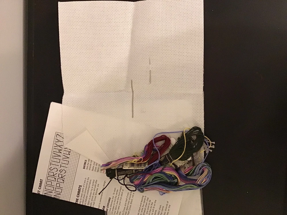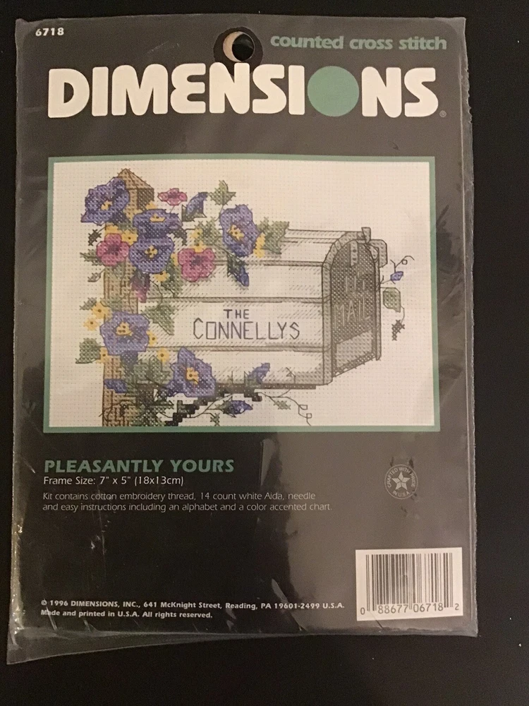 PRODUCT IS OPEN AND 1 Line completed. The product is a vintage 1996 Counted Cross Stitch Kit by Pleasantly Yours. The kit features a Dimensions model number 6718 and allows you to create a cross-stitched design measuring 5 inches by 7 inches. This kit would appeal to crafters interested in needlecrafts and embroidery, providing all the necessary materials and instructions to complete the project in a pleasant and artistic way.