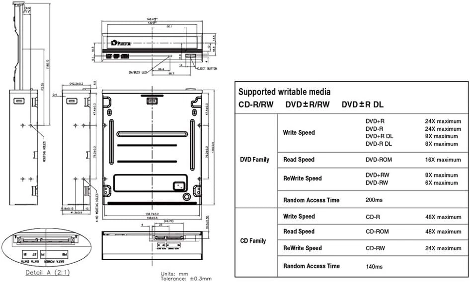 Plextor PX-891SAF 24X SATA DVD/RW Dual Layer Burner Drive Writer - Black Product Details Brand: PlexWriter Item model number: PX-891SA-28 Hardware Platform: PC Operating System: Windows 7, XP, Vista, or later Item Weight: 1.2 pounds Product Dimensions: 6.7 x 5.75 x 1.6 inches Item Dimensions LxWxH: 6.7 x 5.75 x 1.6 inches Color: Black Manufacturer: PlexWriter Operating System: Windows 7, XP, Vista, or later Special Feature: Noise Reduction Technology Hardware Interface: SATA 3.0 Gb/s Brand: PlexWriter Optical Storage Write Speed: [24x (DVD), 48x (CD)] [Highly accurate and reliable] DVD recording at 24X. Supports full range of common DVD and CD formats including DVD-/+R, DVD+/-RW, CD-RW and CD-R. [Secure Media Speed Stability] Ensures that media duplication speed does not exceed encoded maximum rates to provide better burning [Stable Recording Control] The drives have an extensive database of media specs and are better able to communicate and convey these details [Archival Burning Capability] Able to burn virtually all makes of specialty archival media, including the 1000-year M-Disc brand. [Stable burning throughout] Provides consistent and reliable burning of any file type for the duration of the duplication progress to ensure the recorded media has far greater reliability of playback or that the discs will successfully copy to begin with.