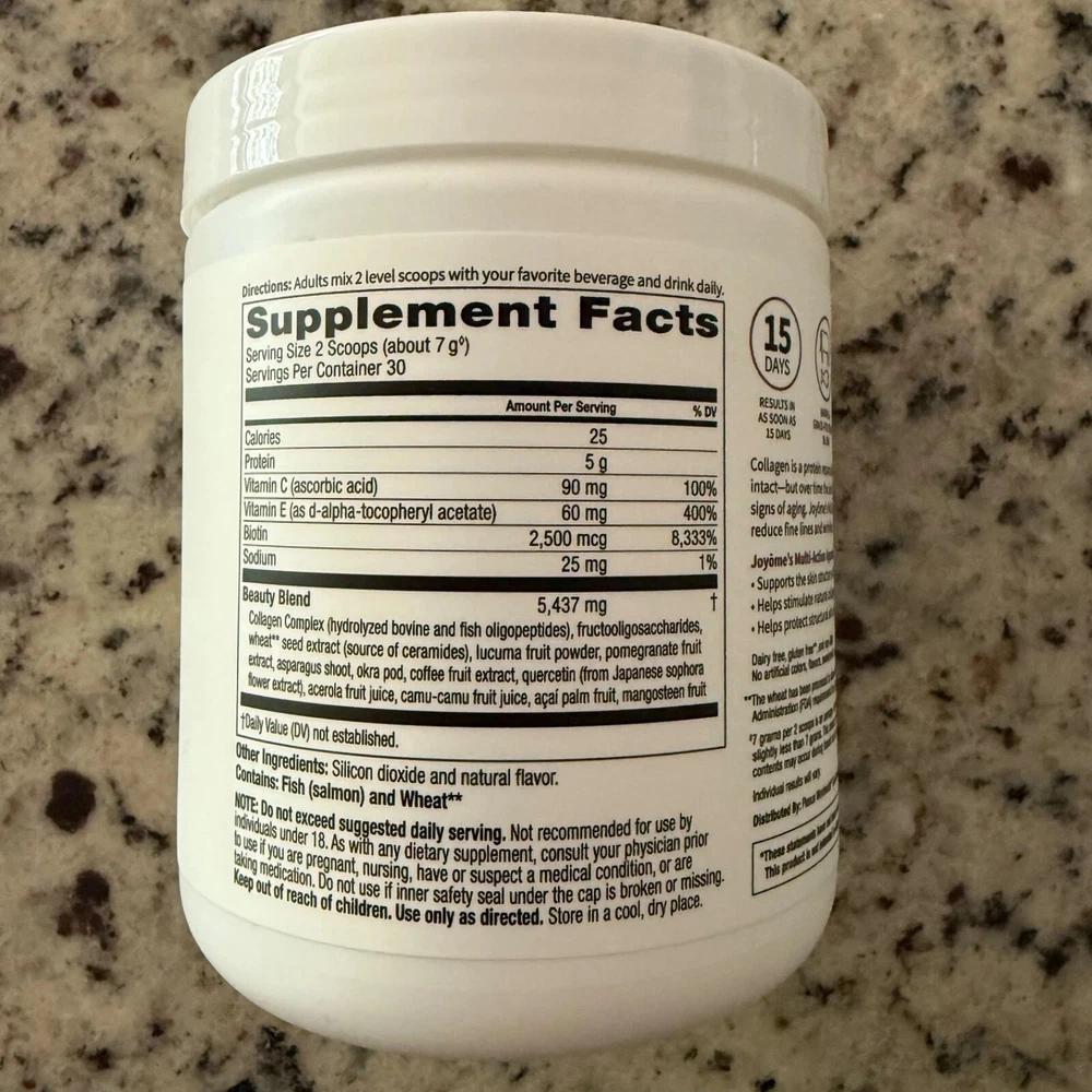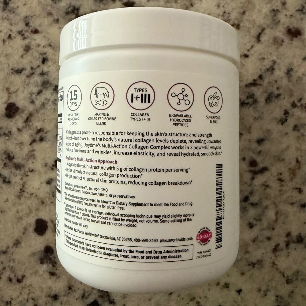 ** US STOCK - FAST & FREE SHIPPING ** Plexus Joyōme Neutral Flavor - Multi-Action Collagen Complex 7.6 oz Exp. 07/27 This advanced collagen supplement powder supports your skin’s structure, boosts your body’s natural collagen production, and reduces collagen breakdown to leave you with flawless skin.* What's Included 30 SERVINGS Helps improve appearance of cellulite with long-term use* Helps strengthen skin structure and dermal matrix* Helps protect the skin’s structural proteins* Collagen peptides stimulate collagen synthesis* Helps reduce collagen breakdown* Reduces crow’s feet, fine lines, and wrinkles* Helps improve skin appearance and minimize unwanted signs of aging* Naturally derived ceramides help hydrate and plump skin* Supports healthy hair, skin, and nails* Helps improve skin texture and reduce roughness* Supports and replenishes skin’s natural antioxidants* Features Results in as little as 15 days ^ Highly bioavailable types I and III collagen peptides Wild-caught marine and grass-fed bovine hydrolyzed collagen Contains superfoods and superfruits Provides potent photoprotective antioxidants to help minimize visible skin damage caused by environmental factors* Neutral flavor can be added to any beverage Contains FOS, the same prebiotic found in Joyōme age-defying serums, and the same ceramides found in the Illuminating Day Serum Dairy free, gluten free ** , and non-GMO No artificial colors, flavors, sweeteners, or preservatives How to use Adults mix 2 level scoops with a favorite beverage and drink daily. Shipping This item is IN STOCK from warehouse in USA and ready to ship within 24 hours. We strive to make the shipping process as easy as possible. Most of our items ship out within 24-48 hours and take 3-8 days for delivery. If you have any questions about our shipping policy or delivery times please don't hesitate to contact us. We DO NOT ship to the following: PO BOX & APO/FPO Addresses Hawaii, Alaska, Puerto Rico, & Virgin Islands. We ship to the continental 48 US States Only.