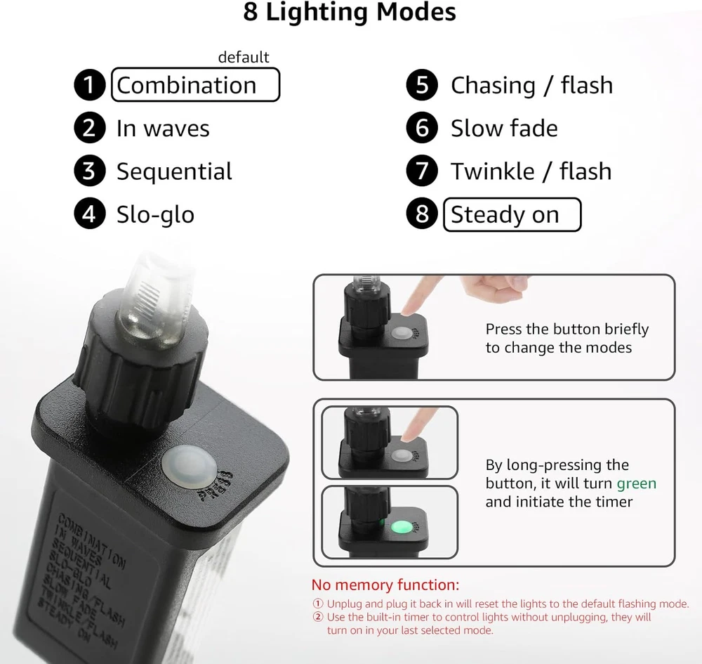 Store New Arrivals Add to Favorite View Feedback Contact Plug in Rope Lights with Small Tube, 1/4 in Pencil-Size, 100 LED Copper Wire String Lights in 33 Ft Tube, Cool White 6000K, Thin Light Rope for Railing, Fence, Balcony, Not Connectable Description Item model number EA430033-DW-US Light Source Type LED Style Garden Number of Items 1 Power Source Corded Electric Number of Light Sources 100 Control Method Touch Light Direction Adjustable Theme Christmas Batteries Included? No Maximum Compatible Wattage 3.5 Watts Assembled Height 0.24 inches Controller Type Button Control Batteries Required? No Average Life 15000 Hours Product Dimensions 396 x 0.24 x 0.24 inches Material Polyvinyl Chloride Assembled Width 0.24 inches Seasons Christmas Is Discontinued By Manufacturer No Light Color White Included Components 33ft 100 LED Rope Light, UL Certified Power Adapter with Standard US Plug, 6.6ft Cord, 6 Languages User Manual, 100% Satisfaction Guarantee Customer Service Item dimensions L x W x H 396 x 0.24 x 0.24 inches Color Rendering Index (CRI) 80.00 White Brightness 120 Lumens Indoor/Outdoor Usage Outdoor Bulb Base E26 Medium Bulb Features Not Dimmable Water Resistance Level Waterproof Assembled Diameter 0.23 inches Item Weight 11.2 ounces Assembled Length 396 inches Specific Uses Above-Ground Pool Occasion Christmas Special Features Corded Special Feature Corded Part Number 430033-DW-US Shade Color Clear Color Temperature 6000 Kelvin Certification UL Certified Power Adapter Color Daylight White Wattage 3.5 watts Voltage 4.5 Volts (DC) Plug Format A- US style Shade Material PVC Luminous Flux 90 Lumen [Mini Size Rope Lighting] The tube thickness is 1/4 inch, which is smaller than the classic 3/8 inch or 1/2 inch light ropes. [100 LED Copper Wire Fairy Lights Inside a 33 ft Clear Tube] The wire length is 4.9 ft, with lights spaced 3.9 inches apart. The lights are not overwhelmingly bright but are bright enough for illuminating paths or providing deck accent lighting or ambient lighting. [Not Connectable] This strand cannot be connected to another. Do not cut it to shorten the lights. [Built-in Timer] The auto on/off timer is set for 6 hours on and 18 hours off. Press and hold the button to activate the timer (the button will turn green). Press and hold again to disable the timer (the button will turn white). [No Memory Function] The lights will not retain your selected settings if unplugged. Use the built-in timer for automatic on/off operation (without unplugging); they will turn on in your last selected mode. Product Description Mini Size Rope Lighting The tube thickness is 1/4 inch, which is smaller than the classic 3/8 inch or 1/2 inch light ropes. Easy to Install The thin and slender hose is lightweight and flexible, capable of bending at 90-degree angles. It is easy to manipulate around objects and is not overly visible when not lit. 100 LED Copper Wire Fairy Lights Inside a 33 ft Clear Tube The wire length is 4.9 ft, with lights spaced 3.9 inches apart. The lights are not overwhelmingly bright but are bright enough for illuminating paths or providing deck accent lighting or ambient lighting. Thickness/Diameter 0.24 inch / 6 mm(pencil like) Light length 33 ft LED quantity 100 pcs LED lights spacing 3.9 inch / 10 cm Wire length 4.9 ft / 1.5 m Wattage 3.5 watt Brightness 90 lumen Input / Output 120 V AC / 4.5 V DC Weight 0.77 LB / 0.35 KG Not dimmable Do not use it with an inwall dimmer No memory function Does not compatible with separate timer switch, dusk to dawn sensor Not connectable Do not trim the hose Not Connectable This strand cannot be connected to another. Do not cut it to shorten the lights. 8 Lighting Modes Typical 8 modes: Combination, In Waves, Sequential, Slow Glow, Chasing/Flash, Slow Fade, Twinkle/Flash, and Steady On The default mode is Combination . The last mode is Steady On Briefly press the button to choose from 7 flashing patterns and a steady-on mode. How to get to the steady on mode No memory function. Unplug and plug it back in will reset the lights to the default flash setting. Hit the mode button 7 times to get to the steady on mode Without unplugging the lights,there are 3 methods to turn on lights in the steady on mode 1. Using the built in timer to control lights on/off. 2. Disconecting and re-connecting the wire from the plug box. 3. Cutting the line and putting an in-line switch in. Built-in Timer The auto on/off timer is set for 6 hours on and 18 hours off. Press and hold the button to activate the timer (the button will turn green). Press and hold again to disable the timer (the button will turn white). Does not compatible with a separate timer switch or remote switch. Low Voltage The output voltage is 4.5 V DC, ensuring minimal heat emission. Safe for outdoors, not a fire risk. It is safe to place on wooden fences, tents, or trees. Do not connect it to 5 V power source or 12 V / 24 V landscape light transformer. Waterproof The lights sealed in the plastic tube are waterproof. If using rope lighting outdoors, be sure to use waterproof PVC or silicone sealant to secure the transformer. Easy to Use Plug and Play. Rope is flexible and not stiff so easy to place where you want. Packed with 8 clips and nails. ABOUT US We offer the best prices around on high quality products. Our E-store includes media such as books, movies, music and games while offering electronics, toys, sporting apparel, clothing, tools, general home, garden items and more. SHIPPING We are always working hard to ensure your package arrives as soon as possible. Please understand that some factors like weather, high postal traffic, and the performance of shipping companies are outside of our control. We offer free shipping to the lower 48 states and ship within 2 business days of payment, usually sooner. We do not accept P.O. Boxes. Please provide a physical address. For shipping outside of the continental USA, we only use eBay's Global Shipping Program.The item is shipped to KY and then sen