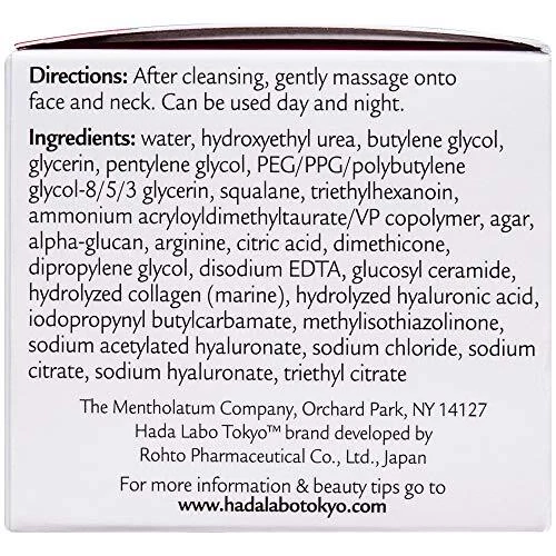 Formulation: Cream Skin Type: All Skin Types gtin13: 0310742018493 Main Purpose: Early Signs of Aging, Hydration, Wrinkles Ingredients: Glycerin Package Dimensions LxWxH: 2.76x2.72x2.52 Inches Body Area: Face Department: Unisex Size: Regular Brand: Hada Labo UPC: 0310742018493 Type: Wrinkle Filler, Moisturizer EAN: 0310742018493 Weight: 0.4 Pounds ISBN: 0310742018493 Features: Contains Collagen, Paraben-Free, Perfume-Free, Contains Ceramide, Contains Hyaluronic Acid, Colorant-Free Color: Gray