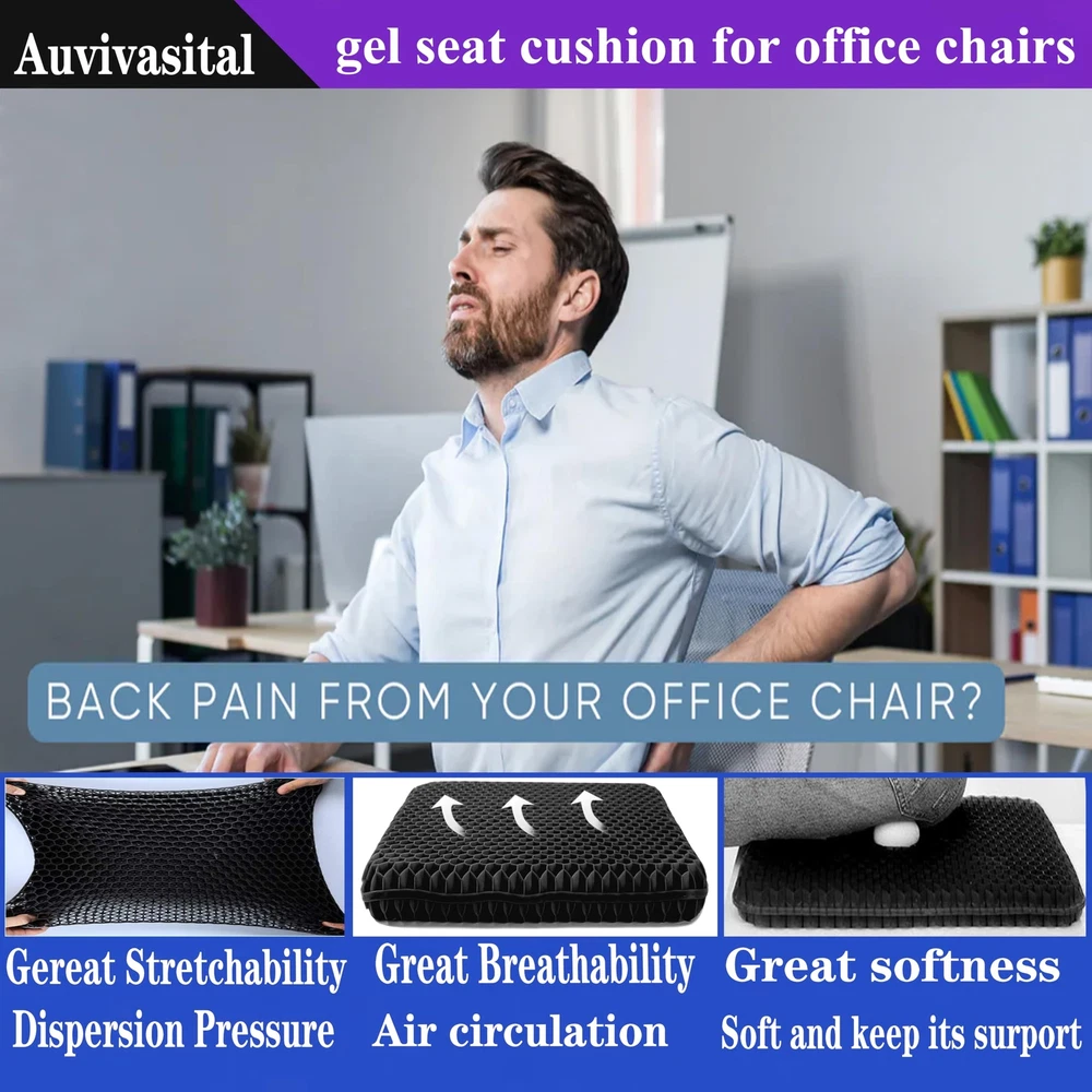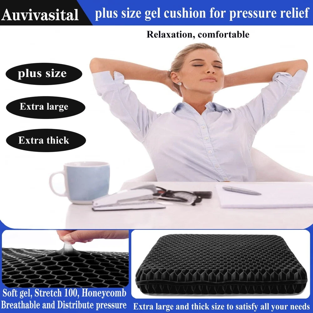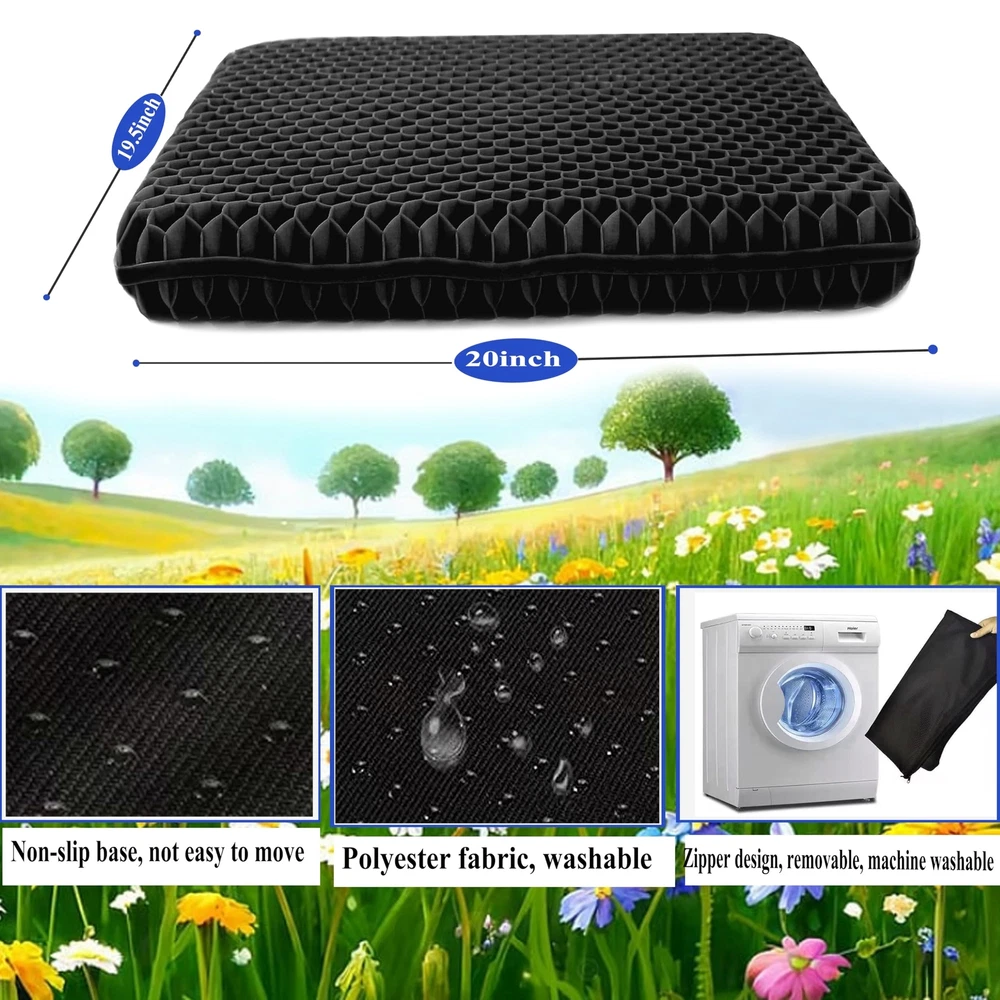 đ„ăDesign and ApplicationăDesigned according to solid geometry three-dimensional technology, the hexagonal honeycomb provides softness and comfort without losing support. Combined with the medical application experience effect, effectively relieve pain in the lower back, sciatic nerve, tailbone pain relief,and buttocks. It is helpful to your health and it's a trustworthy seat cushion. đ„ăPlus Size, Extra Large and Thick Gel Seat CushionăThe size is: 20Ă19.5Ă2 inches. it's larger and thicken enough to solve your problem of the size is not big enough and sitting to the end . Our business philosophy is do our best to satisfy customers' needs for our seat cushions, Customers are God. đ„ăGet the Pain Relief You DeserveăFrom the perspective of physics, it achieves the result of releasing your own gravity and dispersing body pressure, finaly, you will get the effect of relieving pressure and pains, allowing you to get the seating comfort and body freedom you deserve. đ„ăSuper Soft, Keep its ShapăMade with high-quality gel, retains its shape and comfort and has strong cushioning. In addition, it is characterized by heat shrinkable elastomer gel material, it restores to its original shape as soon as it is stretched and squeezed, it's more durable than conventional cushion. đ„ăZipper design, Easy to clean, Easy to carryăThe gel seat cushion with breathable mesh cloth Non-Slip zippe cover, easy to disassemble and assemble, facilitates the cleaning of the seat cushion, It is packaged in a black cloth bag with a drawstring, and you can easily carry it anywhere. đ„ăWidely UseăItâs used in many different places, such as: Office, Kitchen Dining Room, Living Room, Patio, Couch, Recliner, Car, Truck, Train, Airplane, Classrooms. You can also take it to stadium, benches and bleachers. It also can be used as Pet Cushions.