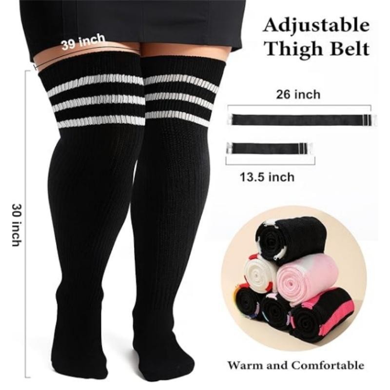 [Truly Made for US Cute Girls] : Our thigh high socks are designed with plus size in mind! The size of our thigh highs socks are enlarged and widened, which is completely suitable for big girls. The plus size thigh high stockings are about 35'' long, the stretched length is about 42'', about 7'' wide, and the stretched width is up to 39" circumference. If your upper thigh measures smaller than 25'' and these socks may too big for you. [Coming with Extra Long Thigh Garter] : Say goodbye to annoying body adhesives and the embarrassment of sagging or rolling off. If you want to fixed the plus size socks to any length you want, I think you'll love the thigh garter. The matching thigh straps' width are adjustable and they can stretch up to 44.5'' circumference, they are super elastic and you can adjust them to suit your needs. [Breathable High Elastic & Slip into Comfort] : The plus size thigh highs are made of soft acrylic yarn fabric to keep you and your legs warm and comfortable! Soft and high elastic material fits snugly to your calves and thighs. Make your legs look longer without suffocating your thighs. These extra long thigh high socks can bring you the freshness of early spring, romance of fall, warmth of winter and confident beauty of women. [Various Wear Ways & Show Fashion] : There are many ways to wear our plus size striped thigh high socks! They wrap around your beautiful thighs like cute leg warmers or fold up into over the knee socks! Wear it with shorts, jeans or mini pleated skirts for a casual dress, high or ankle boots on fall or winter, and a variety of uniforms for party! You can also wear our comfortable socks for yoga, cosplay, roller Derby, pole dancing, and even as you hang out at home! [Best Gift and Choices for Big Girls] : Our womens high socks are the perfect gifts and accessories for Birthday, Mother's Day, Christmas, Halloween, New Year Day or Thanksgiving Day. And we are committed to providing you with a happy shopping experience. If missing thigh garter or any defective problems, please contact us to help you and we will reply to you within 24 hours.