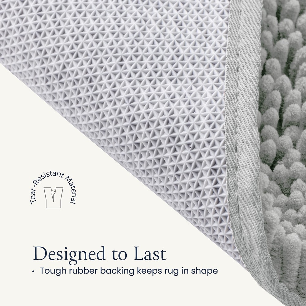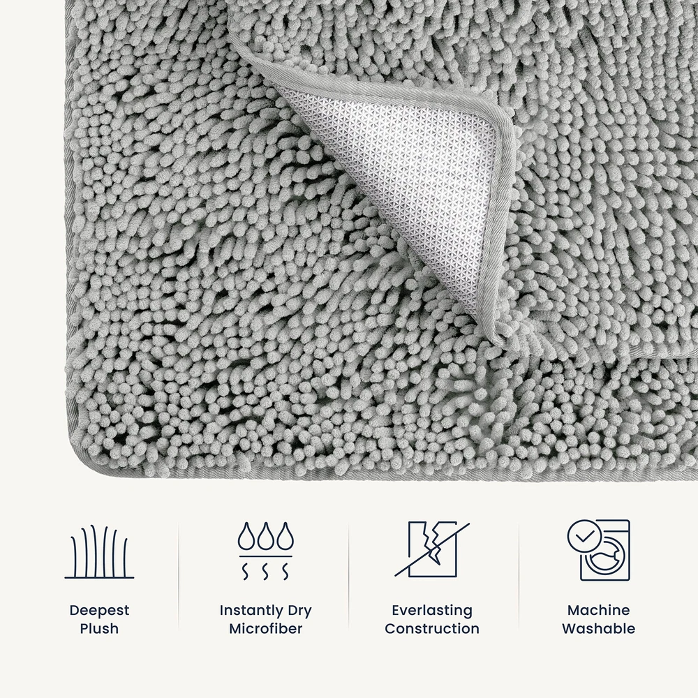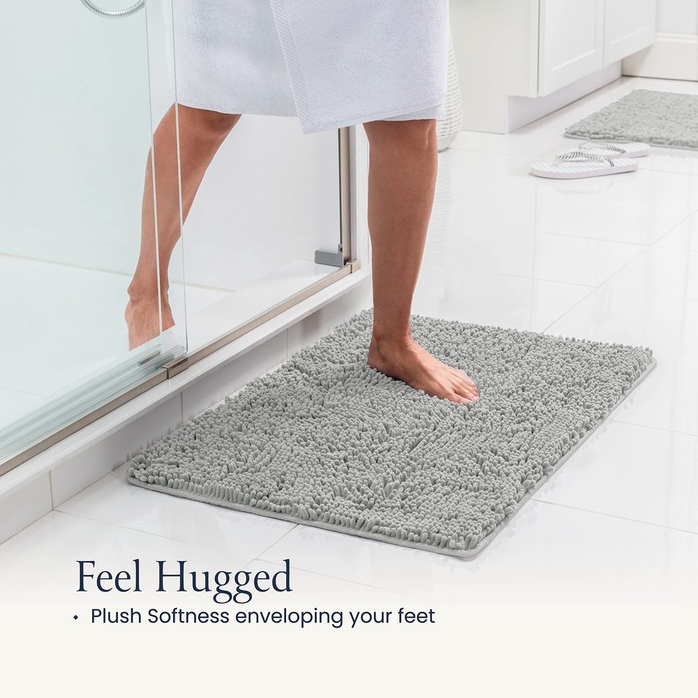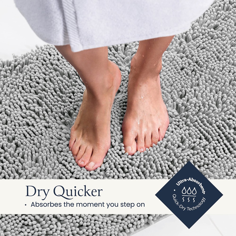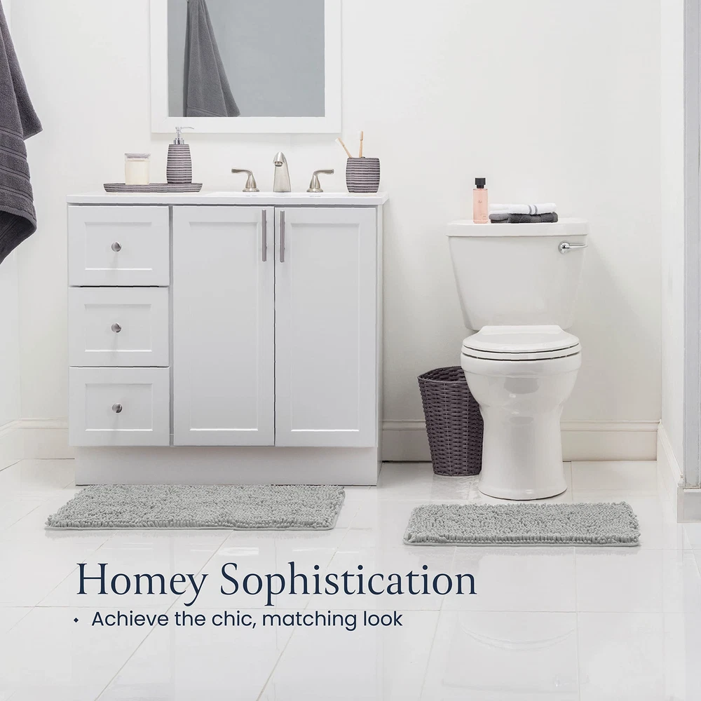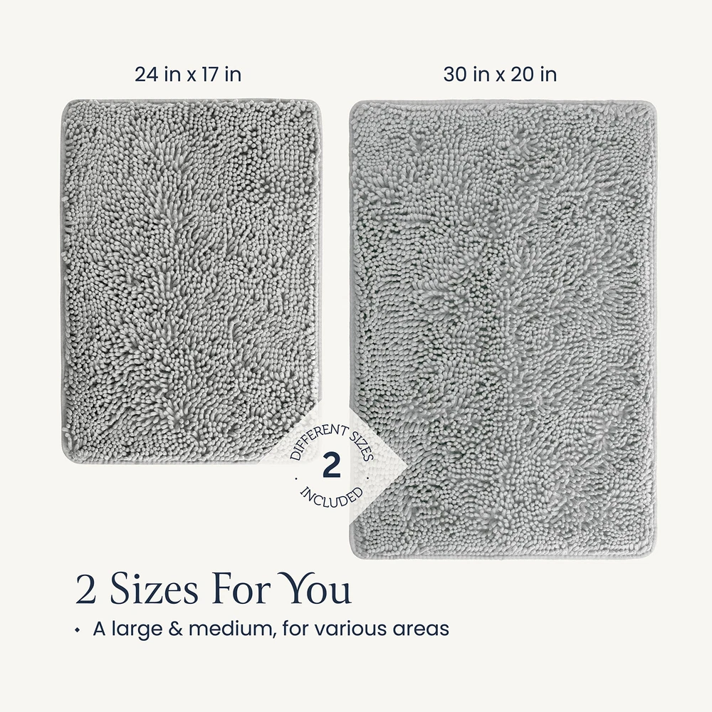 Plush Feel - Sink into dreamy softness enveloping your feet after your bath. This rug is made out of high-pile chenille for the plushest sensation that will make you feel luxuriously pampered and grant you a fuzzy warm welcome instead of the harsh, cold floor. Absorbent Rug - Instantly dry your feet as you step out of the shower just by standing on this magically absorbent shaggy rug. Protect your floor from water damage by having the mat pat your soles dry and catch the drippings from your hair. Quick Dry - Crafted of specially formulated microfiber, the rug air-dries in minutes but is also safe for machine washing and drying without losing its soft feel or sharp color. Won’t retain moisture, preventing odors and bacteria. Rubber Backing - The bath rug has a nonslip rubber backing to ensure it doesn’t slip and slide as you step on it. The backing gives this rug unmatched durability essential for high-traffic areas in your home. Please make sure it is on a clean and dry floor or it may pose a hazard. Chic Design - The mats will arrive in a set of 2, one large and one medium, so you can match your bath and vanity areas. Add a homey, upgraded appearance to your bathroom or spruce up your entryway, bedroom, or kitchen.