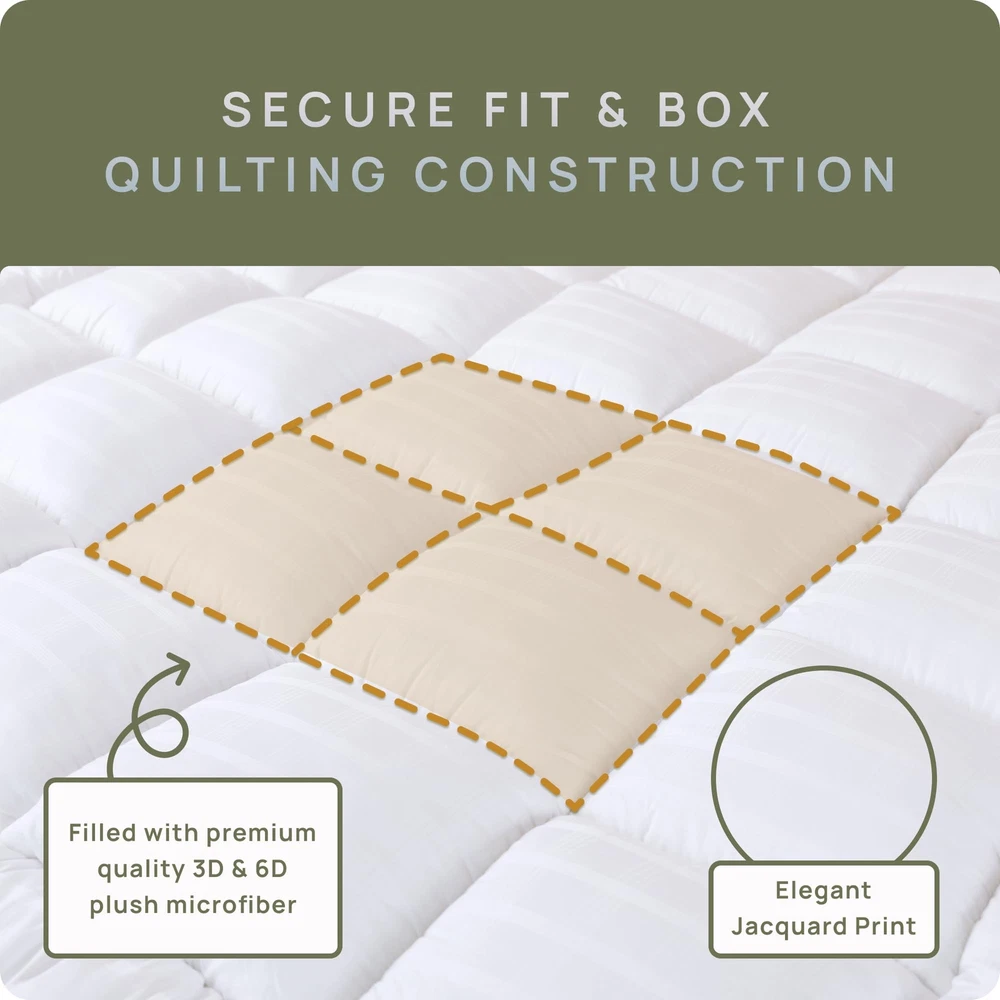 EXTRA THICK MATTRESS TOPPER WITH 3INCH LOFTINESS. Our extra thick full size mattress topper with its 3inch gusset filled with 110oz soft & plush down alternative fiber adds an extra layer of softness to your firm mattress providing you the bouncy feel and cloud-like sleep comfort. PILLOW TOP MATTRESS TOPPER FOR BACK PAIN RELIEF. Filled with premium quality 3D & 6D plush microfiber, this generously filled mattress topper finds a good balance between softness and cushioning and offers optimized support for your hips, shoulders, back, and knees to avoid back ache and leaves you feeling well rested when morning comes. COOLING & BREATHABLE MATTRESS TOPPER. Encased in the softest, lightest and breathable 100% cotton fabric, our mattress topper retain less heat and maintains optimal temperature. No more sweaty nights caused by memory foam pads or traditional mattresses SECURE FIT & BOX QUILTING CONSTRUCTION. Our mattress topper with 4 corner elastic straps adapts to mattress depths from 6" to 22" and ensures a secure fit and allow you toss and turn freely. The box quilting construction prevents the evenly distributed fillings from shifting as you sleep to offer you the most consistent comfort. TIPS FOR USE. It is not necessary to wash your pillowtop before use as it is clean. For best results, tumble dry it on a low heat before use to fluff up the fibers. To extend your bed topper’s life and reduce the need to wash it, position a mattress protector/ fitted sheet over it. Wash bi-annually in a front loader machine on a cool wash. *Please do not use a top loader machine as the agitators destroy the fibers.