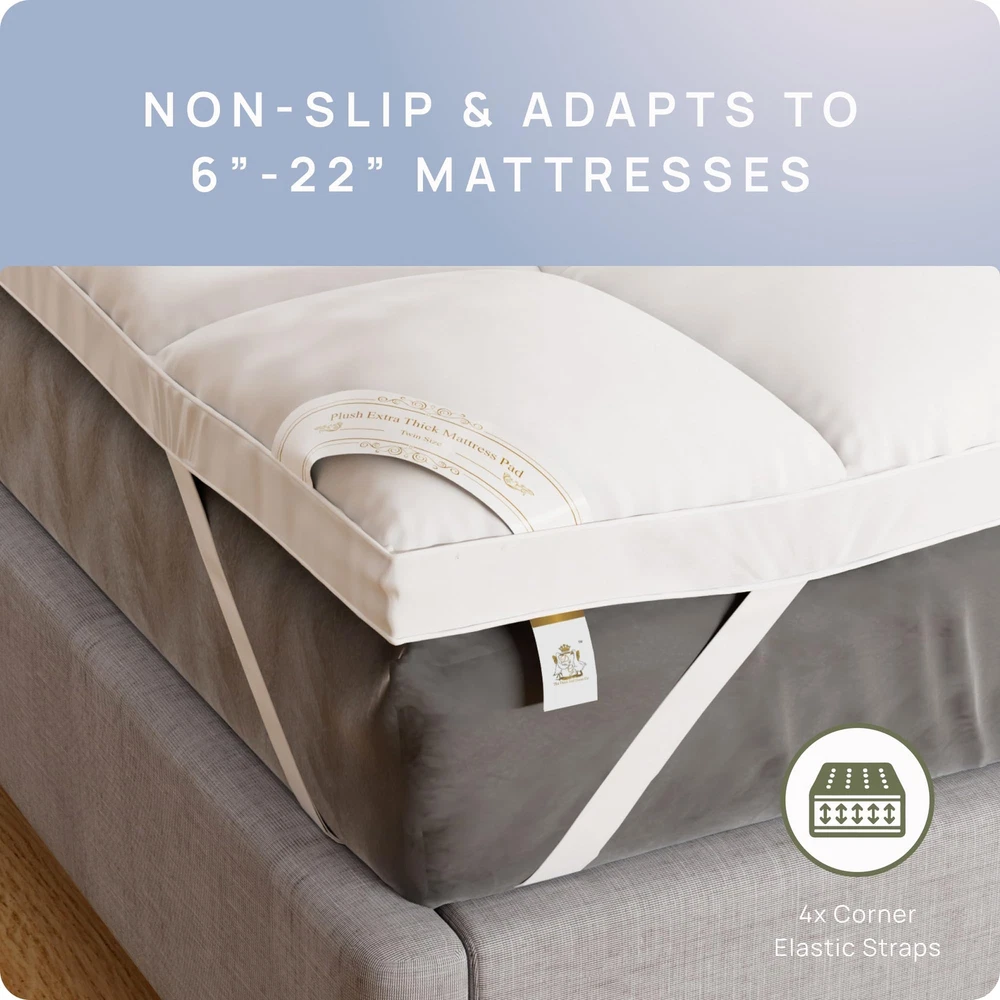 EXTRA THICK COMFORT: Experience cloud-like softness with this queen-size plush mattress topper, generously filled with down alternative gel-fiber, making it the perfect addition to a firm mattress for ultimate sleep comfort. COOLING & BREATHABLE: The soft brushed polyester fabric and breathable gel-fiber filling help regulate temperature, making it a great alternative to heat-retaining memory foam or feather-down toppers—no more sweaty nights! FULL BODY SUPPORT: Ideal for back, side, and stomach sleepers, this ultra-comfortable pillow top mattress topper provides extra cushion and relief for shoulders, back, and hips, helping to alleviate pain and improve sleep quality. SECURE FIT: Featuring 4 corner elastic straps and box quilting design, this topper adapts to mattresses from 6" to 22" deep, ensuring a secure fit and preventing the filling from shifting while you sleep. EASY CARE & MAINTENANCE: Machine washable and easy to maintain, simply tumble dry on low heat to fluff the topper on arrival. For extended durability, cover with a fitted sheet or mattress protector and wash bi-annually.