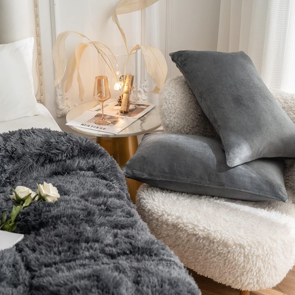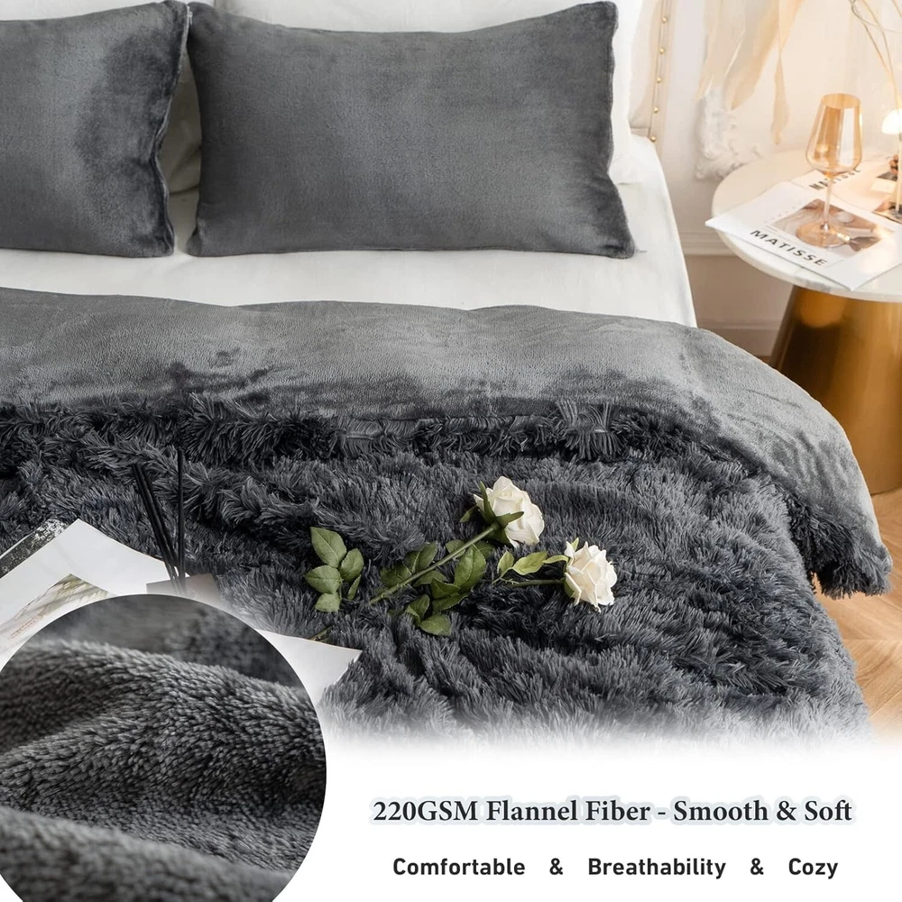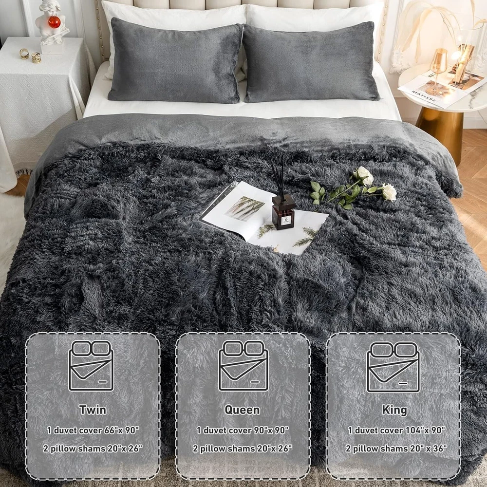 About this item WARM LIKE SPRING – Incredibly soft ! Our plush comforter set is fluffier and thicker than general one;the duvet cover is warm and cosy, adding a cosy, lazy spring vibe to your bedroom;You only complaint may be how hard thing makes it to get out of bed in the mornings! LUXURY SOFT MATERIAL - The bedding front is 380 GSM silky shaggy faux fur, while the reverse is 220 GSM flannel; This duvet cover is warm, comfortable,with long silk-like, luxurious fibers that seemingly engulf your skin in a cradle of comfort,give you a perfect sleep STYLISH - CHOSHOME luxury duvet cover is stylish, with a silent zip for easy removal and washing, 8 corner cords to prevent shifting and keep the duvet cover neat and orderly, and a hidden zip that enhances the overall elegance and beauty of the bedding MULTI-PURPOSE - Tuck the ultra soft comforter into the comforter cover for warmth in cold weather; it also makes a great cold-weather quilt in early spring and late fall;This comforter cover set is perfect for everyday use or as a gift for anyone WHAT YOU GET - This fluffy thick duvet cover set includes 1x duvet cover (104"x 90"), 2x Pillowcases (20" x 26"), Note: Quilts and sheets are not included; Before purchase,we recommend checking your bed's size 380GSM Faux Fur - Thick & Warm The front material is 380GSM faux fur, offering a soft and warm touch. It adds luxury to your bedding while being durable and easy to care for. 220GSM Flannel - Smooth & Soft The 220GSM Flannel backing provides a plush, soft touch for duvet covers, adding both comfort and durability with its smooth, cozy texture. Zipper Closure Zipper closure ensures a secure fit, preventing the comforter from shifting or slipping out and making it easy to remove or insert the duvet. 8 Corner Ties 8 corner ties inside the duvet cover keep the comforter securely in place, preventing it from shifting and ensuring a smooth, even appearance.
