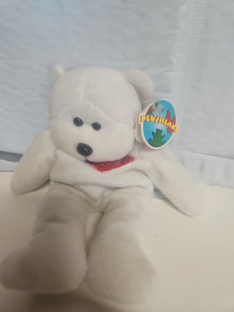 This Plushland white bear is the perfect cuddly companion for all occasions. With a loving expression on its face and a heart on its chest, this polar bear will bring joy to any child. Measuring at a small size of 6-14 inches, it is perfect for children aged 3 to 10 years old. Made in 1999, this loving bear is part of the Plushland brand and features a soft, white fur that is perfect for snuggling. The bear belongs to the Character Family of love bears and is sure to bring a touch of love and warmth to any home. Gently used. From a pet and smoke free home.