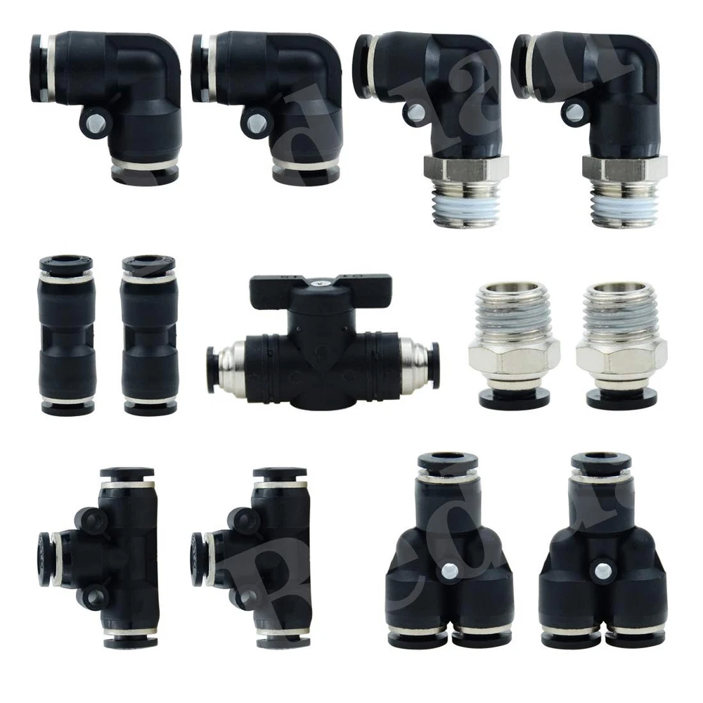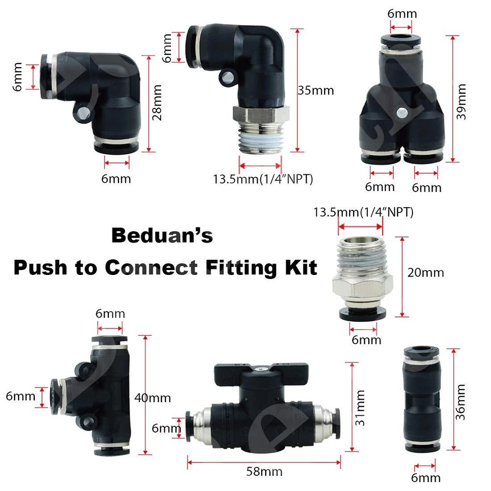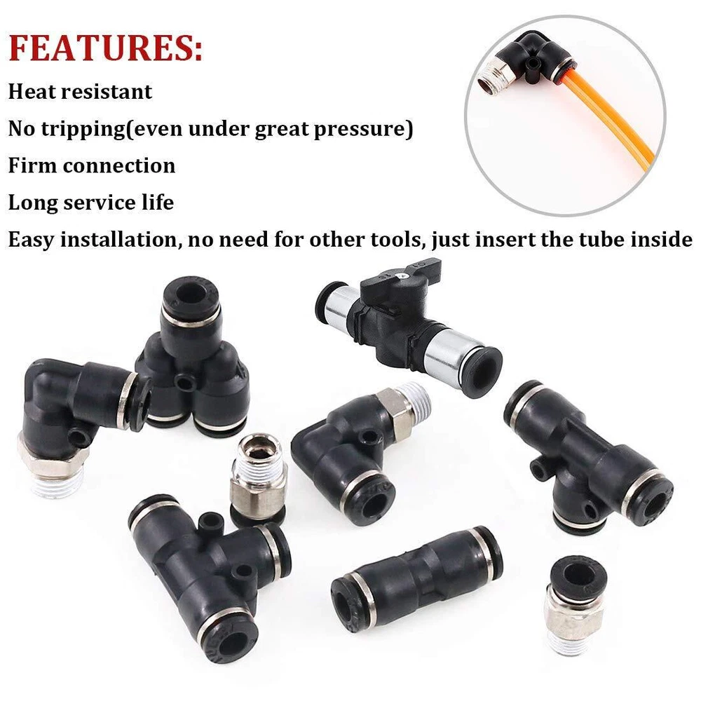 Feature: Easy to install, no need for other tools, just insert the tube inside. All models of push lock fittings are designed to suit your pneumatic piping needs perfectly. Long service life. You can easily change the tubing connector direction. Narrow space is also suitable with the push. Specification: Working Pressure:0-1.0MPa | 0-150psi Applicable Tube: PU / PA / PE / PVC Proof Pressure:3.0Mpa | 435psi.Seal Working Temperature:0-60℃ | 32-140℉; Negative Pressure:-100Kpa | -29.5 In Hg Fluid Type: air, vacuum; Operating Pressure: 0- 150 Psi; Working Temperature: 32~140°F | 0-60°C; Negative Pressure: -100Kpa| -29.5 In H These fittings are selected high quality and the best part is they just need a simple push, provide secure connection. No extra sealing needed. Safe and reliable material. Energy-saving, low-cost, high pressure resistant and non tripping, all taper pipe threads are paint teflon leakage-proof rubber, offering good seal property. Easy to install, available in various styles and models . Each model to serve its purpose. All models of push lock fittings are designed to suit your pneumatic piping needs perfectly Tube Fitting Sizes: 6mm Tube OD straight ( 2pcs ); 6mm Tube OD elbow ( 2pcs ); 6mm Tube OD tee ( 2pcs ); 6mm Tube OD Y spliter ( 2pcs ); 6mm Tube OD x 1/4” NPT - male straight ( 2pcs ); 6mm Tube OD x 1/4” NPT - male elbow ( 2pcs ); 6mm Tube OD - BUC union ball valve ( 1pcs )