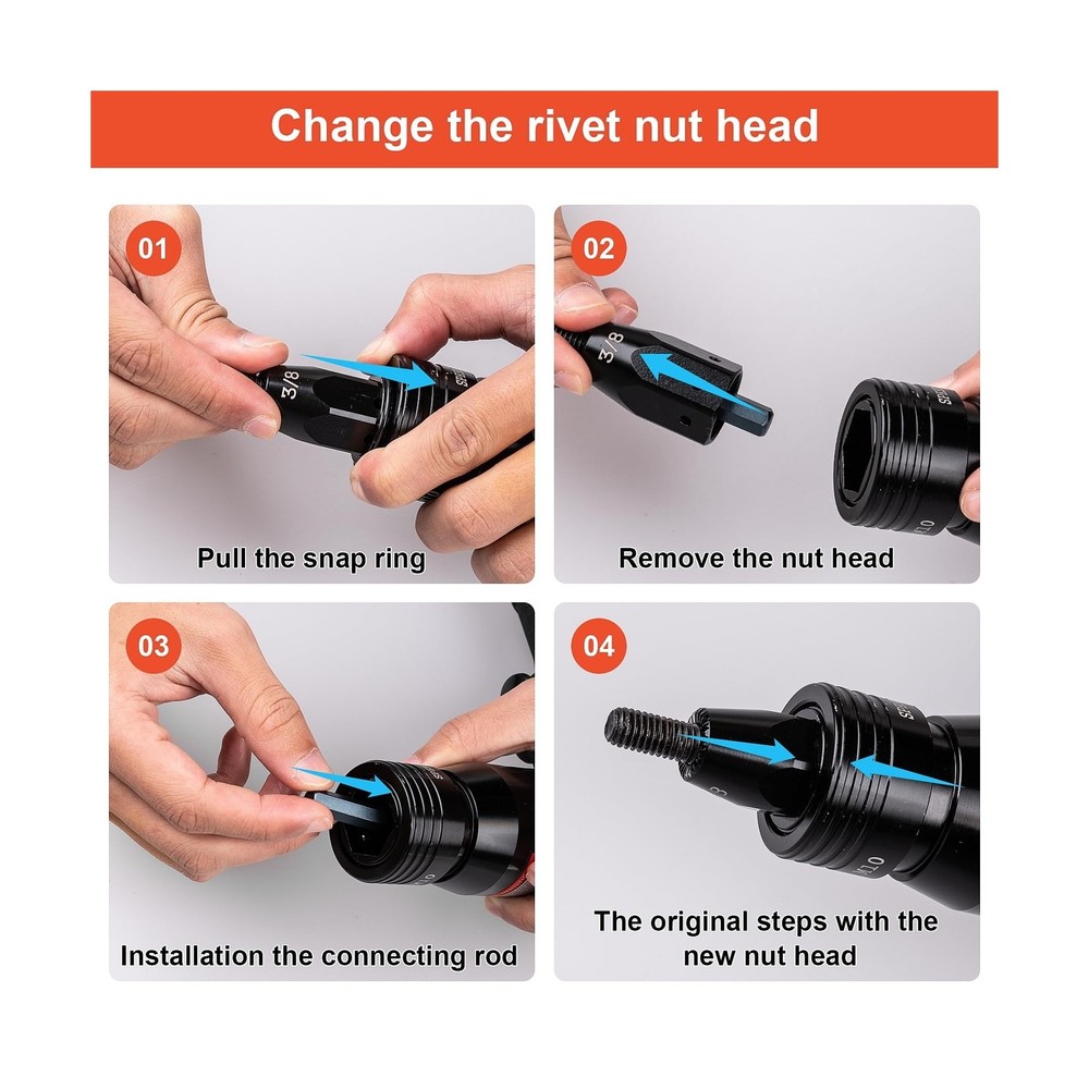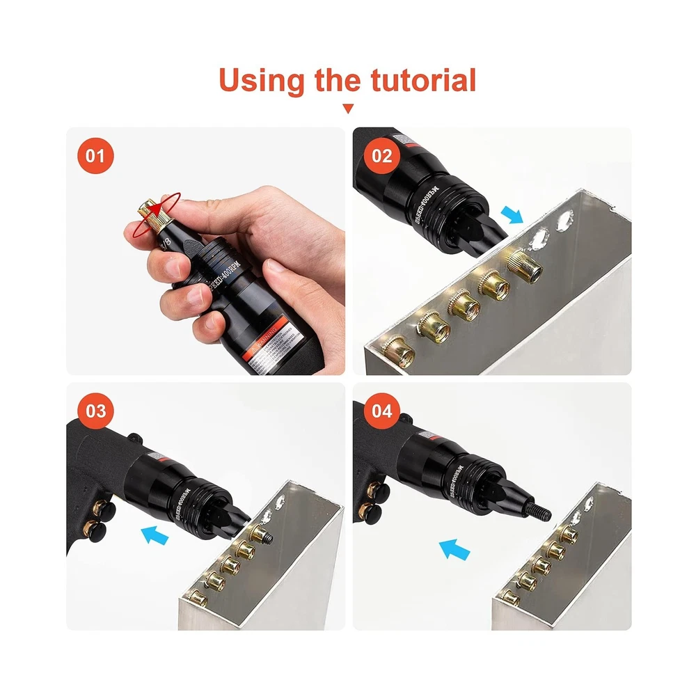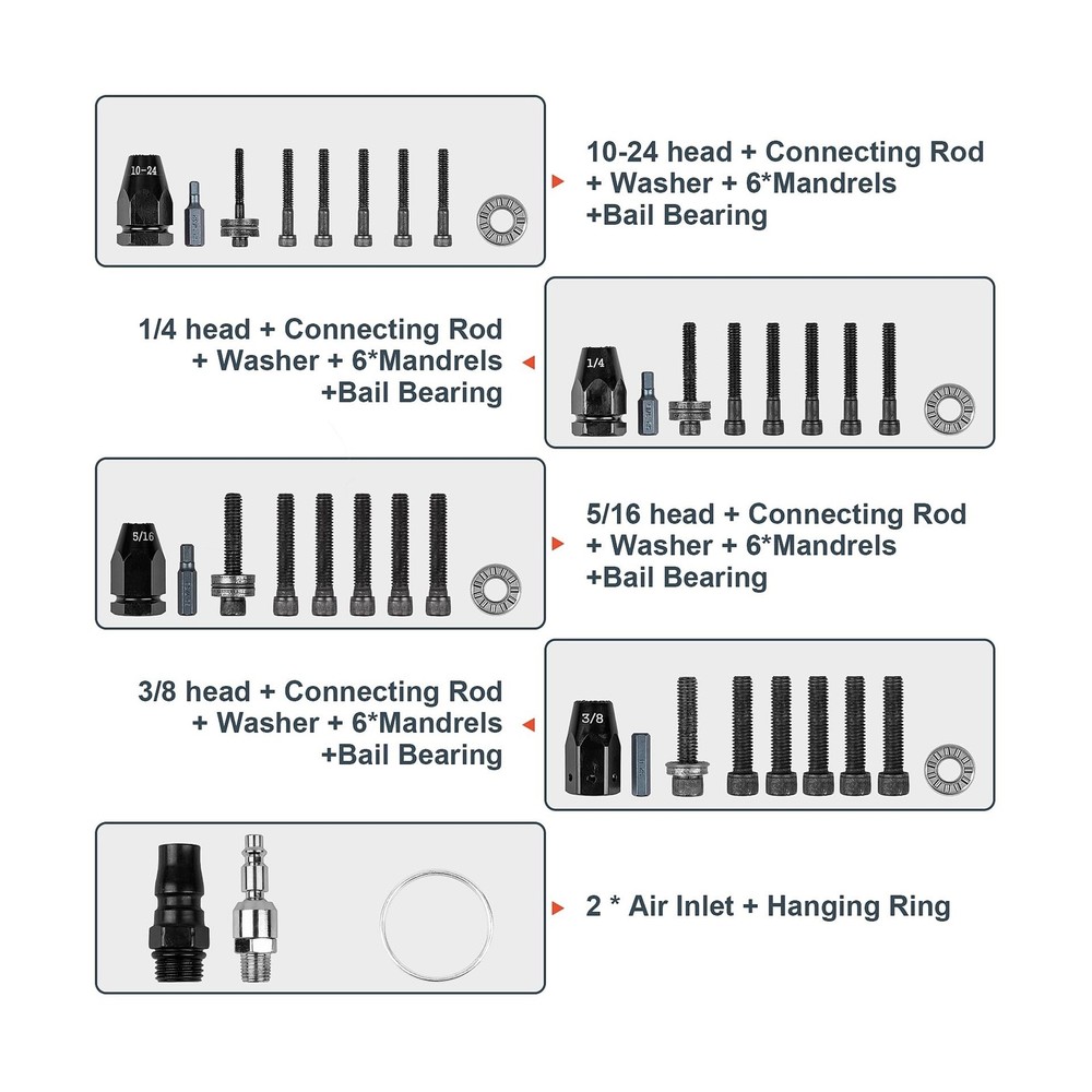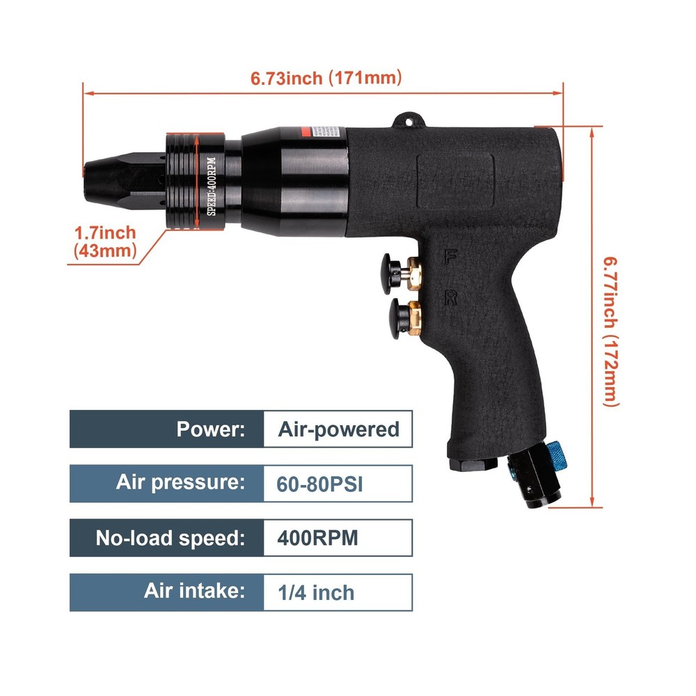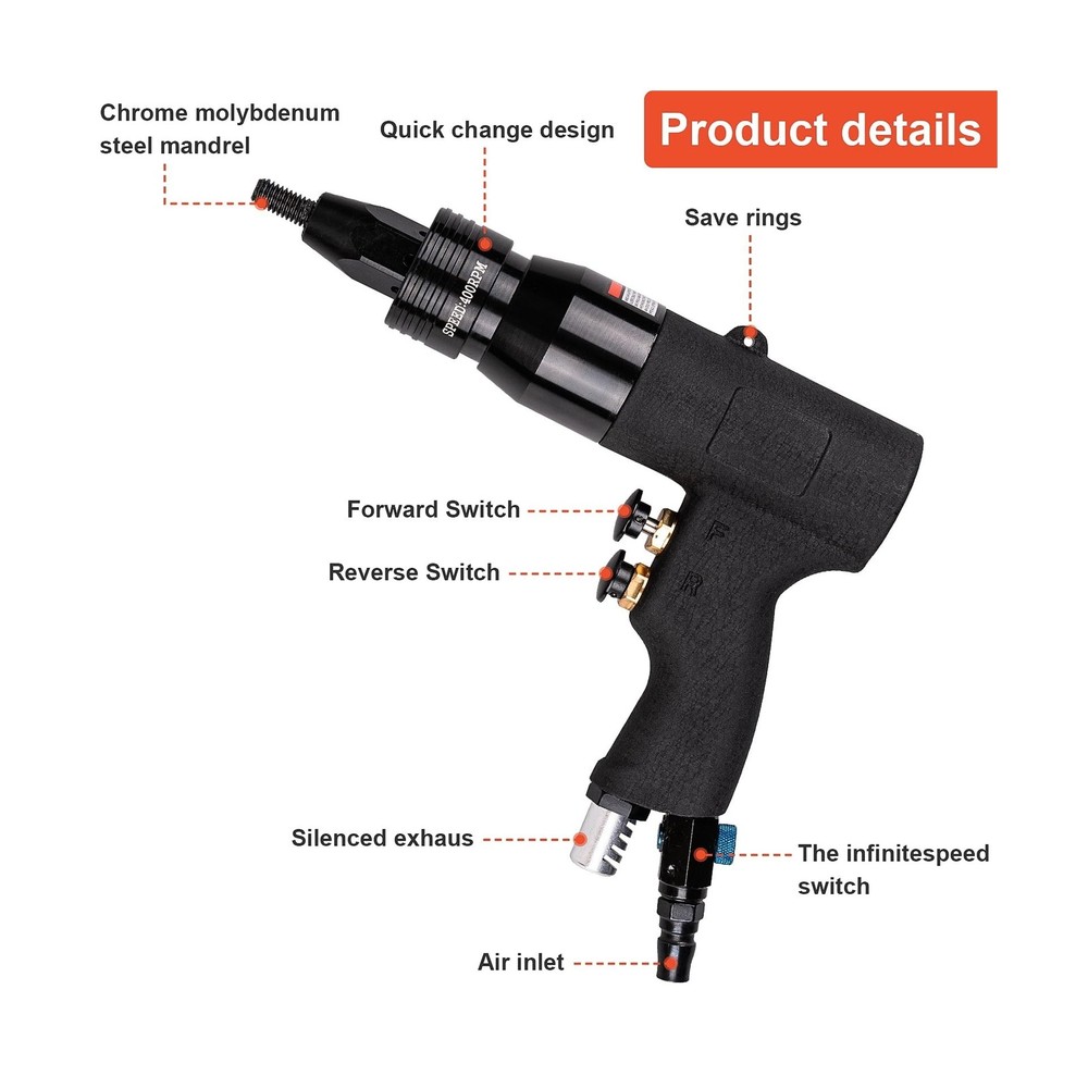 Pneumatic Rivet Nut Gun with 10-24 & 1/4 & 5/16 & 3/8 Self-Locking Head, Adjustable Speed Air Rivet Gun, Air Rivet Nut Tool Kit with 4 Size Quick-Change, 6pcs Mandrels Included with Each Size Description Features: SELF-LOCKING GUN HEAD: Rivet nut tool comes with 10-24 & 1/4 & 5/16 & 3/8 gun heads as well as their 1 bearing & 6 mandrels of each size. The head has a self-locking function that allows you to quickly assemble and disassemble the mandrels for increased efficiency STURDY & TIME-PROOF: The bearing, mandrel, and connecting rod are all made of high hardness alloy steel make the rivet nut gun more wear-resistant. We have added Industrial lubricants to the gun heads to make the service life of the rivet gun longer POWERFUL FUNCTION: The muffler vent is embedded in the pneumatic rivet gun to reduce the noise generated during operation. The air rivet gun with a speed regulating knob to adjust the size of the gas and effectively cope with various working conditions ERGONOMIC DESIGN: Non-slip handle suitable for human hand holding posture, shock-proof design makes the use of the rivet nut gun more comfortable and reduces the fatigue caused by long-term use NOTE: The mandrel is a consumable item, and bearings and industrial lubricants can extend its life. We also provide 6 mandrels for each gun head so you can use it longer. Quality issue or any questions, please come to us. We would work out a satisfactory solution to your problems Product Details: Manufacturer: Clatoon Brand: Clatoon Model: Pneumatic Rivet Nut Gun Item Weight: 4.6 pounds Package Dimensions: 9.41 x 7.56 x 1.97 inches Item model number: PRG-01 Manufacturer Part Number: PRNG-001 Date First Available: August 15, 2023 Delivery We Do Not Ship Outside of the Continental US. Return Policy All items qualify for returns within 30 days of receipt. Seller is responsible for return shipping on any item that is not damaged. Feedback We take our reputation seriously, we buy and sell online, so we understand the value of trust. If you are unsatisfied with your order, please contact us and we will work with you to resolve it to your satisfaction.