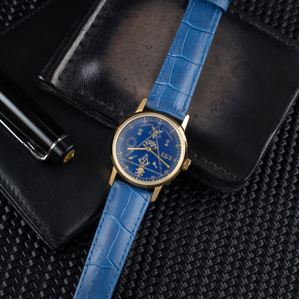 RARE Vintage Pobeda Masonic — 1980s Soviet Timepiece This is an original mechanical Pobeda timepiece from the 1980s, showcasing the unique heritage of Soviet watchmaking. A rare find that combines traditional Masonic symbolism with classic vintage style. A Piece of History: Masonic Design The watch features a striking blue dial adorned with gold-tone Masonic symbols, including the square and compasses, the all-seeing eye within a pyramid, and the skull and crossbones. The dial is marked with "Мировая Коллекция" (World Collection), making it a standout piece for collectors of both horology and history. Design & Authenticity Dial: Elegant blue dial with gold Masonic symbols and clear markers. Hands: Classic gold-tone hands. Authenticity: Features the authentic original mechanical movement. 100% original parts. Condition: Expertly restored vintage watch. Excellent condition, keeping accurate time. Case & Dimensions Diameter: 34 mm. Case Material: High-quality vintage case in excellent condition. Width: 18 mm lug width. Condition: Unworn / Fully functional and professionally serviced. As a vintage item from the 1980s, it may show minor signs of wear consistent with its age, such as slight scratches on the case or gentle patina on the dial, which enhance its character and authenticity. Movement Caliber: Authentic Original Mechanical Pobeda 2602. Type: Mechanical, manual winding. Service: Fully functional and professionally serviced for reliable performance. It runs smooth and keeps accurate time. Strap Material: High-quality strap (as shown in photos). Width: 18 mm. 30-Day Return Policy We are committed to your satisfaction. If you’re not completely delighted with your purchase, we offer a 30-day return policy, provided the watch is returned in its original packaging and condition. Note that return shipping costs are the responsibility of the buyer. International Shipping Packaging: Carefully packaged in a beautifully crafted gift box. Shipping: Premium airmail with tracking number provided. Estimated Delivery: USA: 7–15 days Europe & Other Regions: 7–25 days Handling: All orders are processed within 1–5 business days. Questions & Support If you have any questions or require further assistance, don’t hesitate to ask! I am happy to provide more information to help you with your purchase. Thank you for considering this exceptional piece of history!