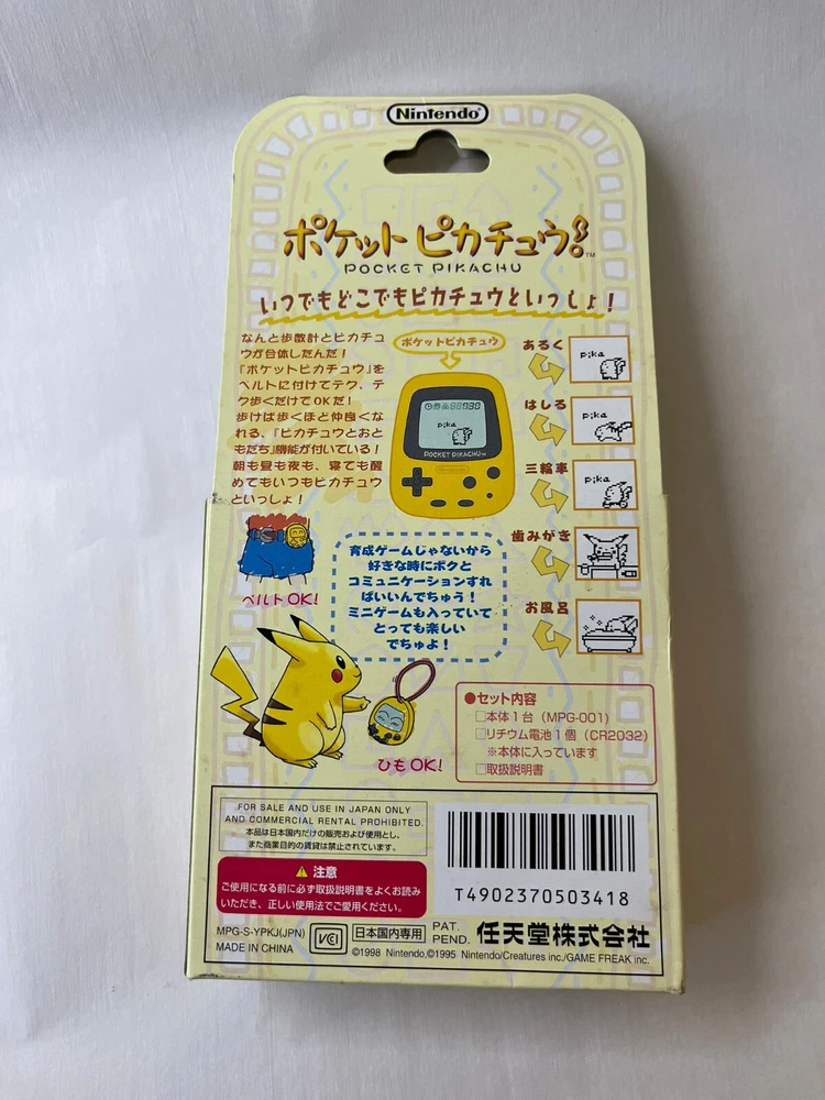 Pocket Pikachu Pokemon pedometer Nintendo New Game Virtual Pet 1998 Brand new item. Item is sold as is. Old item. Box has some wear and tear due to age. This is an OLD item. Wonderful addition to any collection or as a gift. Kept in clean, dry, smokeless home. Kept out of direct sunlight. Buyer accepts all responsibilities of item after purchase and acknowledges the age and state of item. Sales are final, items are sold as is. Payment is required within 48 hours of buying commitment/auction ending date. If payment isn't received, items will be relisted and a case will be opened with Ebay to keep record of the issue. Items will be shipped as soon as payment is received. If you have any questions, please reach out! :)