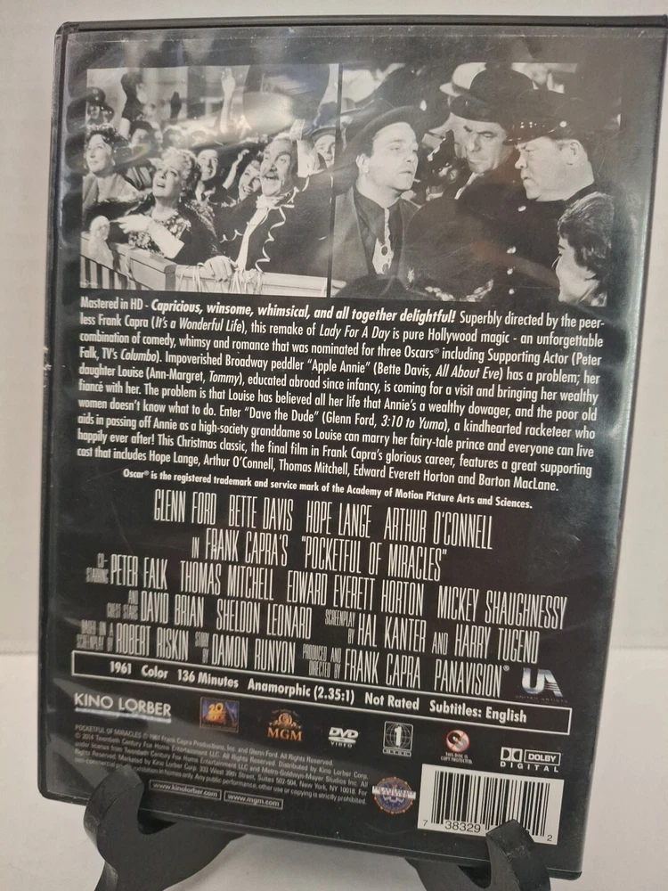Run Time:136 min.Genre:Comedy VideoAspect Ratio:2.35:1Release Year:1961UPC:0738329148522Director:Frank CapraRating:NRActor:Bette DavisFormat:DVDSubtitle Language:Englishgtin13:0738329148522Producer:Frank CapraStudio:KL Studio ClassicsLanguage:EnglishMovie/TV Title:Pocketful of Miracles