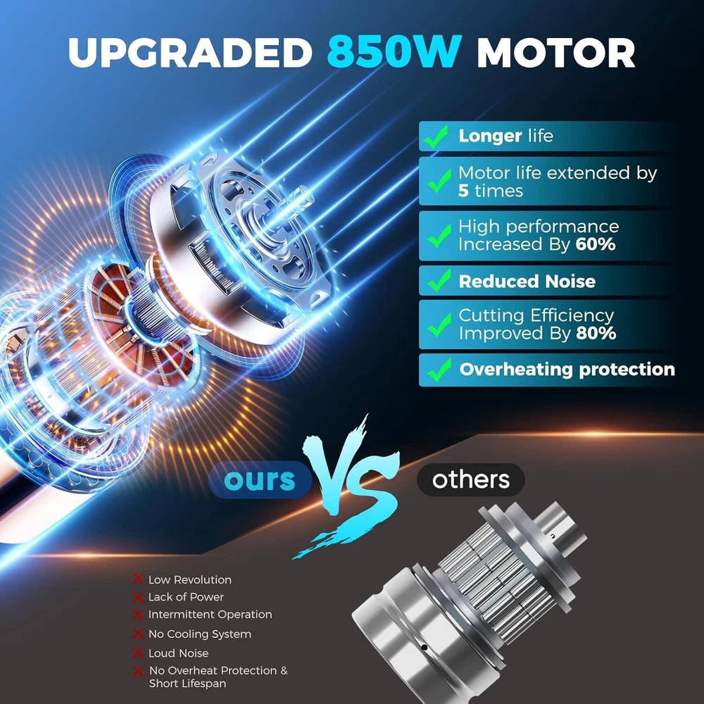 Highly Efficient & Fast & Precise Cutting: High-hardness alloy steel blades and chains, processed through quenching, combine with an upgraded coating to significantly enhance the sharpness and abrasion resistance of our chainsaw. It effectively handles branch-cutting tasks at a high speed. With a 90% improvement in working efficiency, this electric chainsaw saves you time and effort, making it pretty user-friendly. Ultra-Powerful Pure Copper Motor: Our electric chainsaw, driven by a high-power pure copper motor, easily cuts through logs, bamboo, or branches. It delivers strong cutting force with stable, peak performance and a quick-start function. The overheating protection system ensures safety and extends the motor lifespan. Long-Lasting Operation after Fully Charging: The mini chainsaw operates for about 40 to 60 minutes on various cutting tasks, thanks to its 21V 2000mAh rechargeable lithium battery. This battery charges quickly, eliminating the hassle of lengthy or frequent charging. It also displays the current power level (0%-25%-50%-75%-100%), reminding you to recharge and preventing interruptions during use. Multifunctional & Exquisite Electric Chainsaw: To improve safety, clarity and efficiency, the tree chainsaw is equipped with an automatic LED light supplying essential illumination in dim environments. A safety handlebar and dual switch locks complement each other to prevent accidental activation during use. Note: To turn on the chainsaw, press both the start and safety switches simultaneously. Pretty Lightweight & Portable & Flexible: Our cordless chainsaw is pretty lightweight and compact, making it easy to carry and store. It operates efficiently with one hand, providing super flexibility and portability for outdoor cutting tasks, making it a popular choice for those with less strength.
