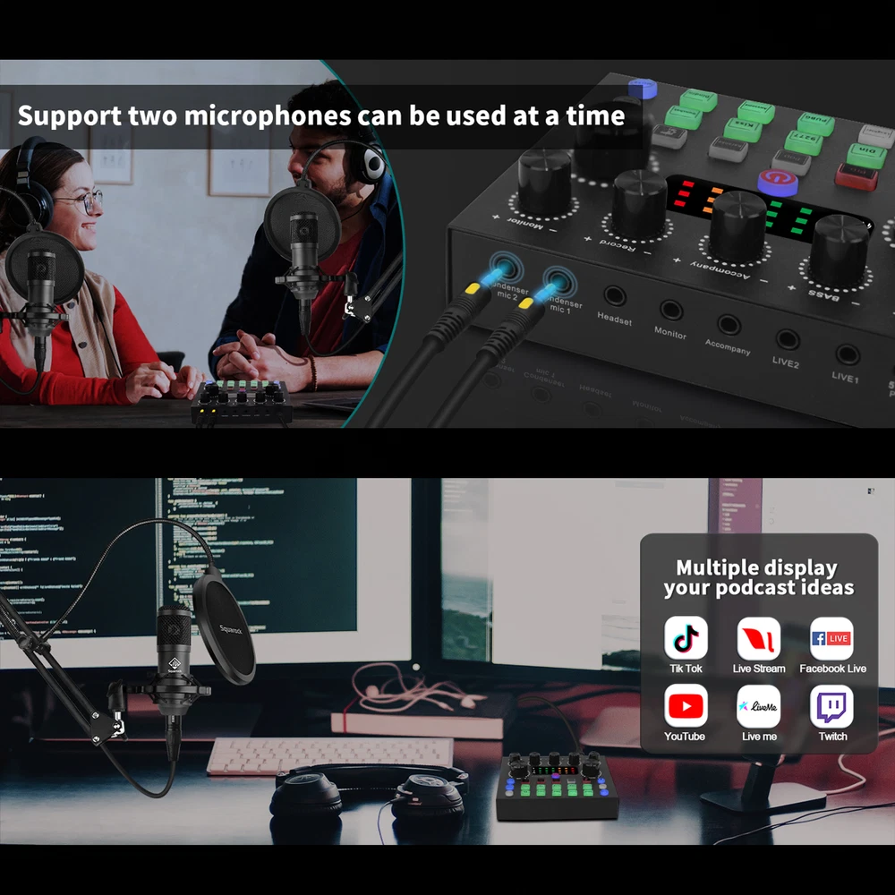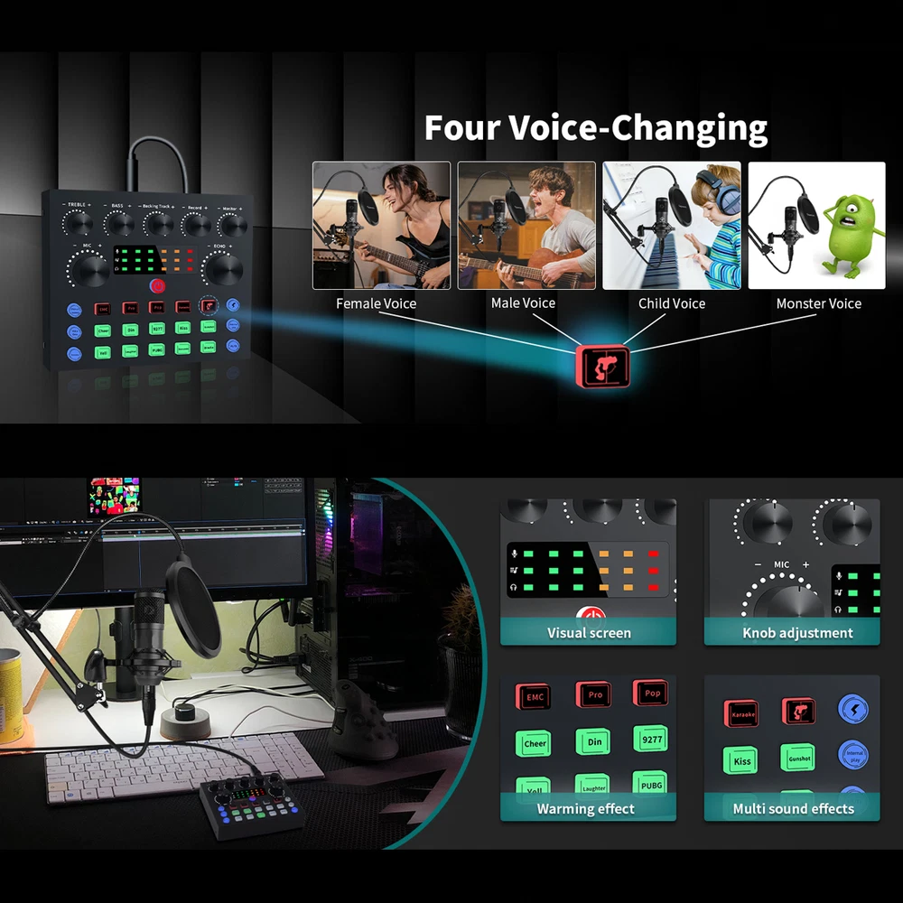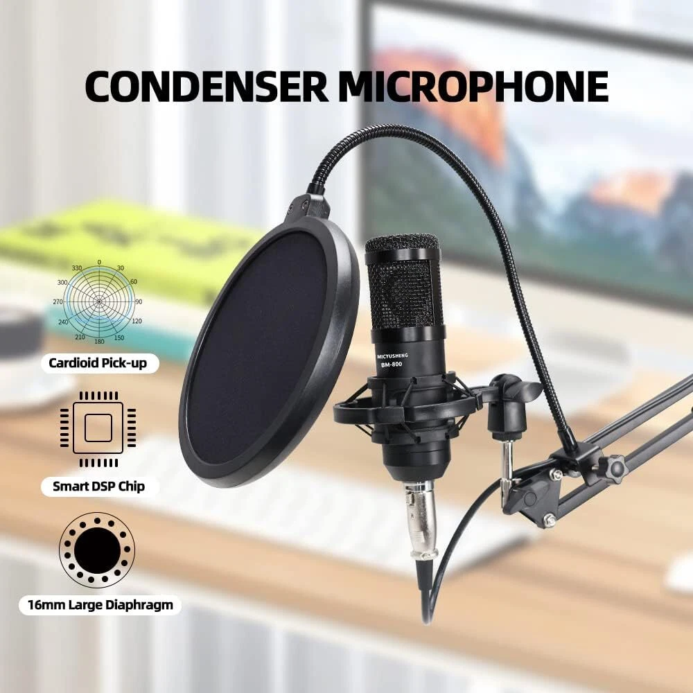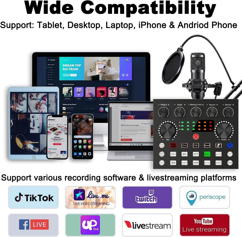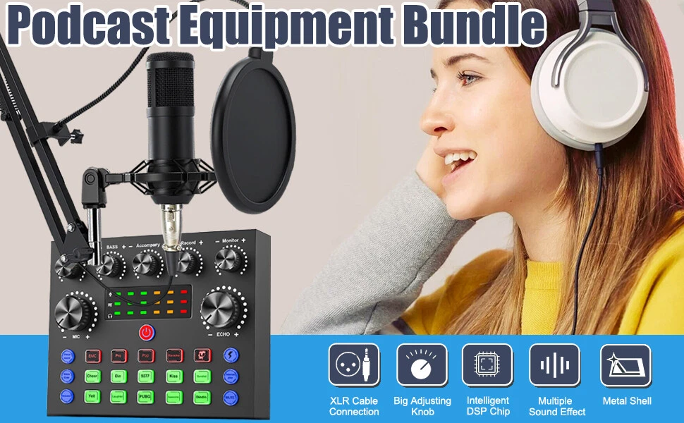 Welcome to NewBeeGoodsfeedback |contact us LocationUnited StatesHoursOpen 24/7SupportFeel free to Contact us ElectronicsMotors SuppliesHome & GardenPet SuppliesBusiness & Industrial NewbeegoodsUSD 58.89Podcast Equipment Bundle Recording Studio kit Audio Interface & All-in-One MixerDescription:The BM800 high-performance microphones are designed to deliver clear, high-quality sound for memorable recordings. It can deliver warm, clear bass, detailed midrange, and a silky high end. It is ideal for vocals, musical instruments, podcasting, voiceovers, interviews, field recordings. Suitable for studios, recording studios, broadcasting stations, personal broadcast, adage performance and computers. Specification:Material: Metal + PlasticColor: BlackPower supply (adapter): DC 5V/1A Battery: 3.7V / 800 mah (Battery life of approx. 5 hours with amplifier on)Power indicator (LED): Power on: white light; Charging: red light; Low battery status: Beep 2 minutes/timesCharging time: about 2 hours (power off) Sound card function: Yes Built-in battery: Yes Low Power Indication: Yes (Beep) Sound Adjustment: Yes Function keys: 5 Sound effect keys: 7 Special effects keys: 10 Connector Type: TYPE-CAccompaniment input: 1 way (3.5 port) Condenser Mic Input: 2 way (3.5 port) Headphone Output: 1 way (3.5 port) Live broadcast interface: 2 way (3.5 port) OTG interface: 1 way (TYPE-C port)Analog Audio Output: LT/RT, Stereo Dynamic Range 1kHz: ≧105dB Crosstalk: ≧-106dB Signal-to-Noise Ratio: ≧85dB Output Level(Vrms): Vrms(1.0~2.0V 10kR) Frequency Response: 5MHz( On Jun 22, 2024 at 06:25:38 PDT, seller added the following information: On Nov 29, 2024 at 06:11:28 PST, seller added the following information: