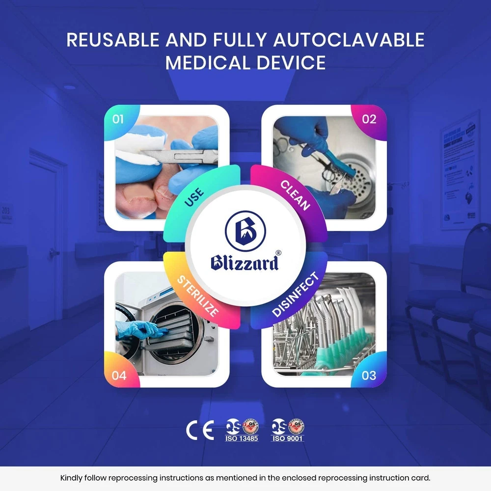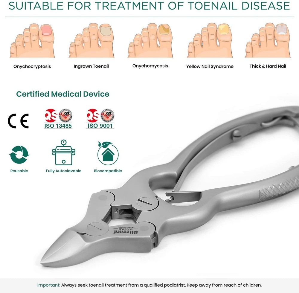 Fed up of ordinary toenail clippers that break the nail, and nippers not reaching parts of the nail when cutting? Toe Nail Clippers are up to the task. Built to last from German steel, these clippers are a hospital grade, fully autoclavable, reuseable medical device. With extremely sharp, concave blades and barrel spring , little pressure is needed when cutting thick, stubborn nails; especially good in the care of the elderly. Sturdy with a heavy-duty fitting, they have a balanced feel which makes them safe and comfortable to use. Chequered handles give you better grip so you can stay in control and cut cleanly. The fitted safety lock reduces the risk of injury and also acts to maintain jaw alignment when the tool is stored in its high-quality plastic sleeve. Easy to clean and maintain in peak condition, it's always ready to use. Packed with a complimentary foot file, this makes a great set. Nail Clippers come with a manufacturer 30-day money back guarantee. Directions for Use: 1. Before clipping, soak feet in warm water for 5 to 10 mins. 2. Using a clean towel, dry feet thoroughly taking care to dry between and under toes. 3. Following the natural contour of the nail when clipping, do not round corners. 4. For brittle nails, use small clips to prevent the nail from splitting or cracking. has a full range of podiatry instruments so why not take advantage of our offers and check out our other listings. Add to Cart today Hospital grade medical device: Our 6” reuseable, fully autoclavable podiatry tool is built from premium German steel to the highest quality standards; ISO 13485 and CE certified Sharp concave blades with spring barrel – Safely cuts through thick, stubborn and ingrown toe nails; Shaped to smoothly cut the parts of nails that can’t be cut with ordinary nippers Chequered handles: Ergonomically designed for your comfort; Allows for stronger and controlled grip while reducing risk of carpal tunnel syndrome often experienced by podiatrists and chiropodists Optimum cutting performance and jaw alignment: Our nail clipper cleanly cuts in one movement; Fitted safety lock reduces risk of injury when tool is stored while also maintaining the tool in peak condition Satisfaction guarantee: Our podiatry clippers are backed by our manufacturer 30-day money back guarantee. Delivered package includes complimentary foot file.