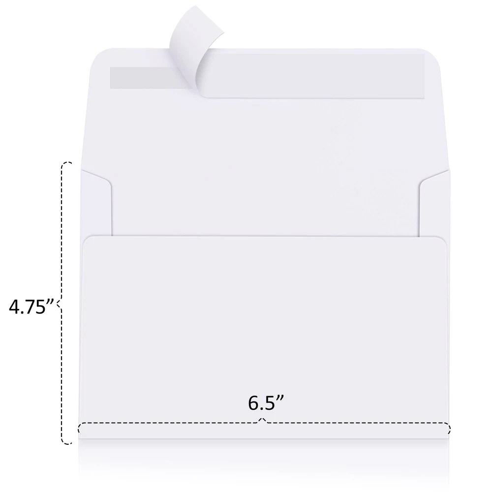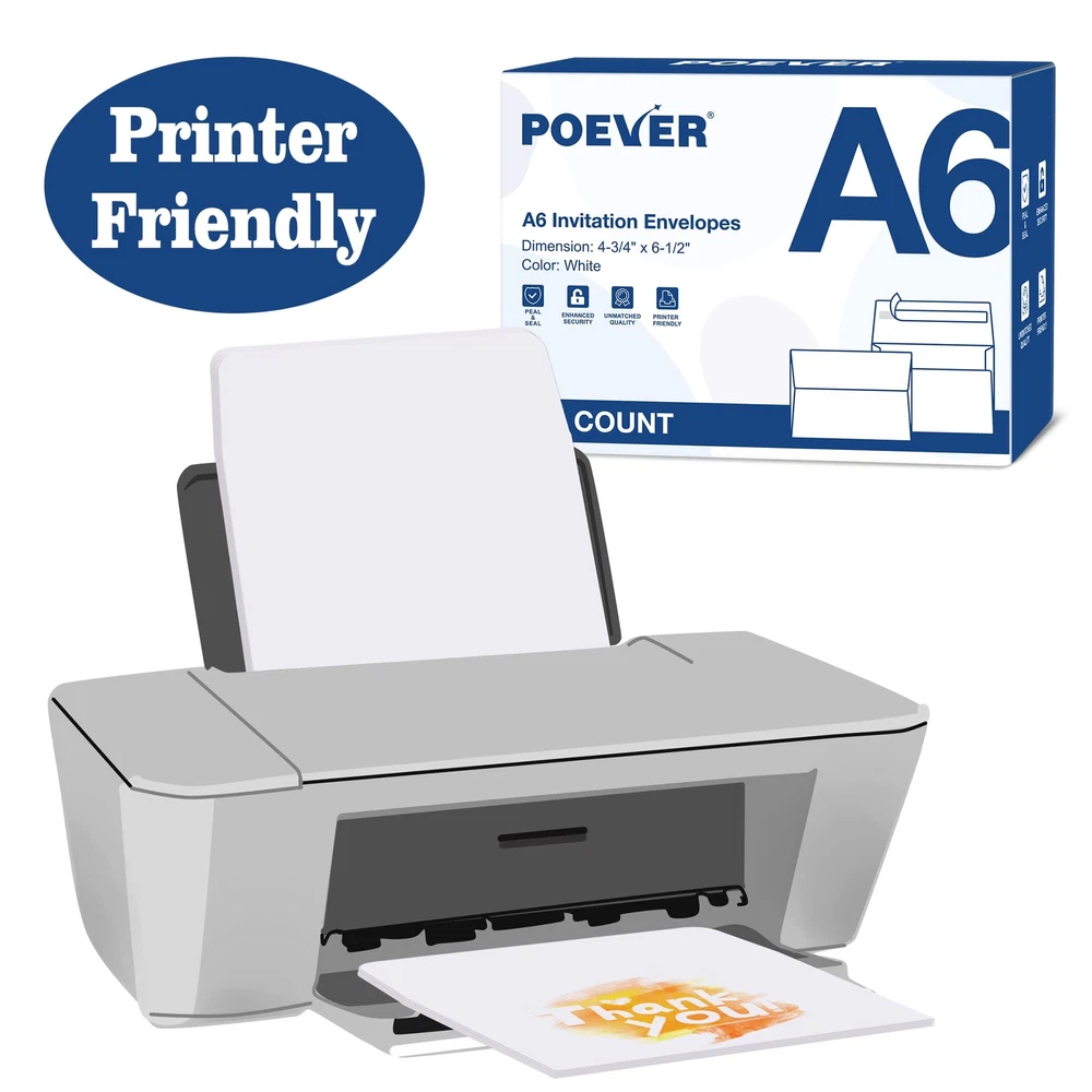 Set of 120 Pack A6 Invitation Envelopes: Poever A6 invitation envelopes set includes 120 pack white envelopes and a sturdy box for shipping protection and easy storage. Each A6 invitation envelope measures 6.5 x 4.75 inches, perfect size for greeting cards, holiday cards, photos, postcards, invitations, letters, announcements, thank you notes, RSVP and more Envelopes Protect Your Privacy: Our A6 small envelopes are made of premium 120 GSM paper stock, which are thick enough to prevent transparency and ensure the items inside are not see-through. Poever White Invitation Envelopes are well-made and durable, prevent your contents from scratch and stain Self-Seal Envelopes For Easy Use and Security: Each A6 white greeting cards envelope comes with a strong adhesive strip for quick self peel and seal, no glue, wax or tape needed. The adhesive strip is strong and lasting, which could create a full and long-time secure seal, protects your documents from damage or falling out of A6 envelopes Printable Blank Envelopes: Poever A6 blank envelopes are compatible with most Inkjet and laser printers, no worry about smudging or jamming. Customize your own envelopes by stamps, stickers, drawing, or printing patterns on them. Ideal for holidays invitation like Christmas, Valentine's Day, Mother's Day etc, and also for party and event invitations like wedding, baby showers, birthday etc. Also perfect for office and business use