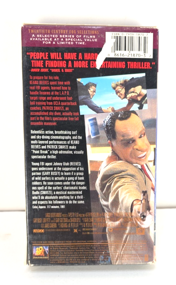 Language: English Rating: R Country of Origin: United States Studio: 20th Century Fox Release Year: 1991 Signal Standard: NTSC Director: Kathryn Bigelow Genre: Action & Adventure Edition: Selections, Full Screen Run Time: 117 Minutes Former Rental: No Leading Role: Patrick Swayze, Keanu Reeves gtin13: 0086162187032 UPC: 0086162187032 Movie/TV Title: Point Break Actor: Keanu Reeves Special Features: Cult Sub-Genre: Crime/Investigation