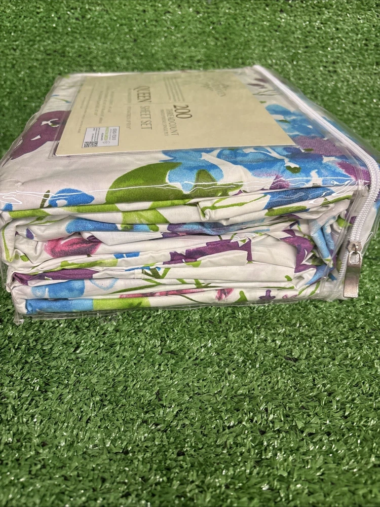 Pointehaven presents a casual style 4-piece Queen Sheet Set with a 200 thread count. The set includes a Queen size flat sheet, fitted sheet, and two standard pillowcases. Made with non-applicable material in a multicolor design, this set is ideal for the bedroom. The Item Width is for a Twin size bed. Listed by-kh Date-1/21/25 Shade/size-blue/purple/white queen Condition-nwt SKU-d69