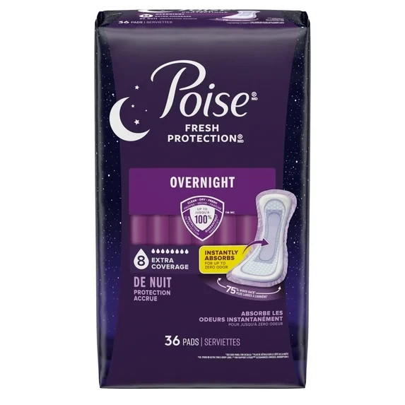 About this item POISE OVERNIGHT INCONTINENCE PADS: 72 incontinence and postpartum bladder leak pads, 8 Drop Extra Coverage (36 pads total) THE BEST NIGHTTIME PROTECTION*: Poise overnight pads for women instantly absorb and rapidly lock away more wetness than the leading period pad for amazing dryness (*vs national brands pads) WORRY-FREE SLEEP: Poise overnight incontinence pads have a 75% wider back** and Leak-Block sides for outstanding dryness and protection (**vs Poise Ultra Thin Ultimate Long) UP TO ZERO ODOR: Each incontinence pad is made with odor-reducing material and helps control odor for up to 12 hours WETNESS PROTECTION: These women’s incontinence pads are made with a moisture-wicking top layer designed to help you feel dry throughout the night SHAPED TO PROTECT: Our women's incontinence pads have a ContourFit design that is softly curved and has a wider front and back to keep you comfortably protected Poise adult incontinence products are HSA/FSA-eligible in the US (check with your provider for coverage details); product and packaging may vary At a glance Features Leak Protection Assembled Product Dimensions (L x W x H) 5.32 x 9.76 x 15.98 Inche