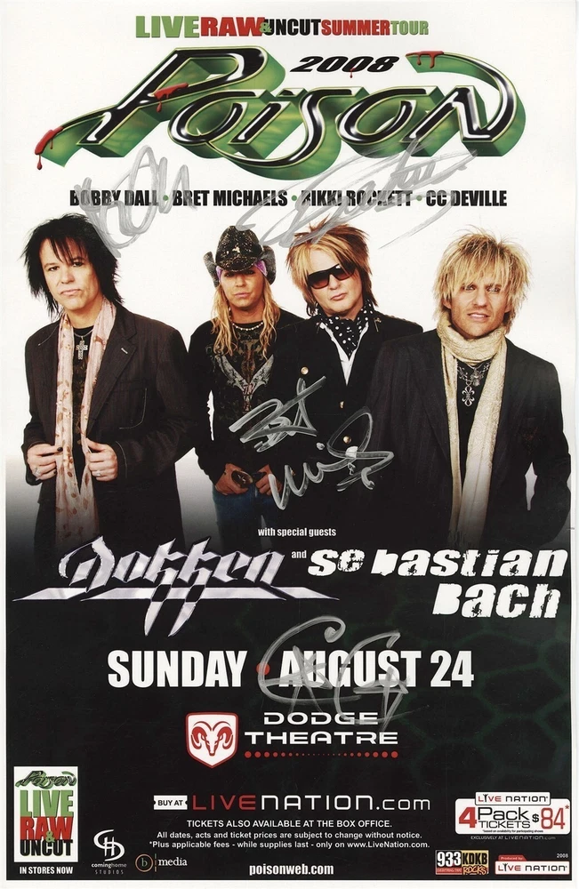 This listing is for an 11 X 17 Poison limited edition autographed gig Poster that was signed by Bret Michaels, Bobby Dall, Ricki Rockett & CC Deville. This signed item was obtained at the August 24, 2008 concert by our RNRW staff and would make a great addition to any Poison music collection., Unfortunately there are many questionable autographed items out there so do your due diligence before purchasing from anyone. We have many other rare Poison collectible items in the Rock-N-Roll Warehouse so if there is something you are looking for do not hesitate to contact us. Rock-N-Roll Warehouse has been partners with JSA (James Spence Authentication) for all of our autographed certifications. We guarantee all of our signed items will pass JSA's stringent guidelines. Rock-N-Roll Warehouse is one of Ebay’s most reputable sellers since 1998. We have one of the largest selections of music memorabilia including vintage band guitar picks, concert backstage passes, concert t-shirts, drum sticks and autographed items. RNRW only deals in official band merchandise and does not sell counterfeit, novelty or bootleg items. We only has a small portion of our overall inventory listed so if there is something you are looking for or have questions about any of our products don't hesitate to send us a message Please view our other eBay listings for more great music memorabilia and rare concert collectibles. Unless noted in the listing description, you are purchasing ONE (1) item only. Added scans may show the front and back of the listed item or additional products that we have in inventory. Rock-N-Roll Warehouse does it's best to describe each and every item correctly. If you feel an item description is not accurate just send us a friendly note and we will look into your concerns. At any time if you are ever unhappy with the quality of any of our items just contact us and we will do our best to rectify all issues with your transaction. Please read all description, payment & shipping info prior to purchasing. TOP $$ PAID FOR VINTAGE COLLECTIONS