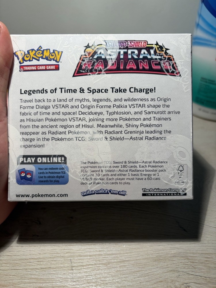 Number of Cards:Over 180Configuration:BoxCard Size:StandardMPN:181-86023Year Manufactured:2022Game:Pokémon Trading Card GameAge Level:6+Features:BoosterCharacter:Origin Forme Dialga, Origin Forme Palkia, Decidueye, Typhlosion, SamurottLanguage:EnglishMaterial:Card StockManufacturer:The Pokémon Company InternationalSet:Astral RadianceNumber of Boxes:1
