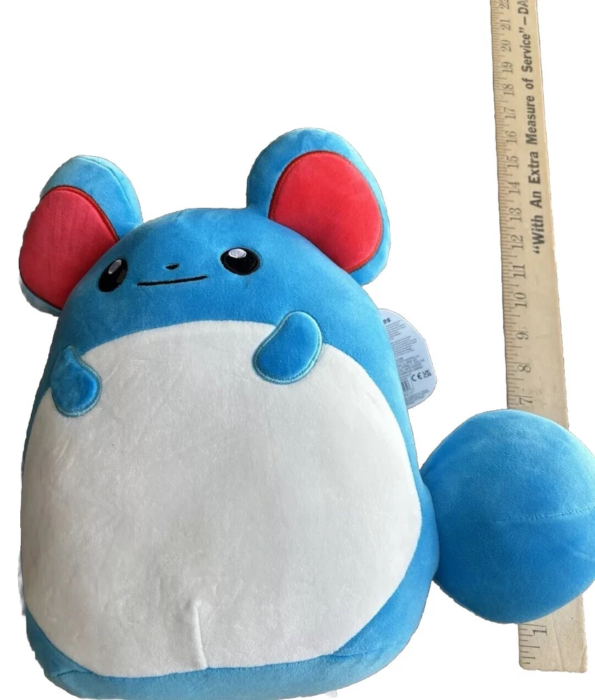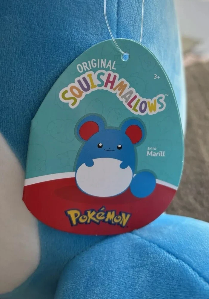This is a new Squishmallow stuffed animal featuring Marill, a character from the Pokemon universe. The plush toy is medium-sized, measuring 14-24 inches, and is designed to be soft and squishy, making it a great collectible for all ages. The toy is made by Squishmallows, a well-known brand in the stuffed animal industry, and is part of their Pokemon collection. Thanks for looking 👀!!!