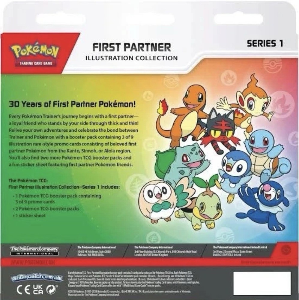 This is PRESALE set to arrive between April 26th and May 7th. I will keep you posted on shipment and when this will arrive. The Pokémon TCG First Partner Illustration Collection Series 1 is a highly anticipated product featuring exclusive illustrations from the Mega Evolution set. Manufactured by The Pokémon Company, this English-language box set is aimed at collectors and Pokémon enthusiasts aged 13 and above. This limited edition collection, set for release in 2026, offers a unique opportunity to own special cards and artwork from the beloved Pokémon franchise. Perfect for fans looking to add to their CCG collection, this presale item is sure to be a hit among Pokémon TCG enthusiasts.
