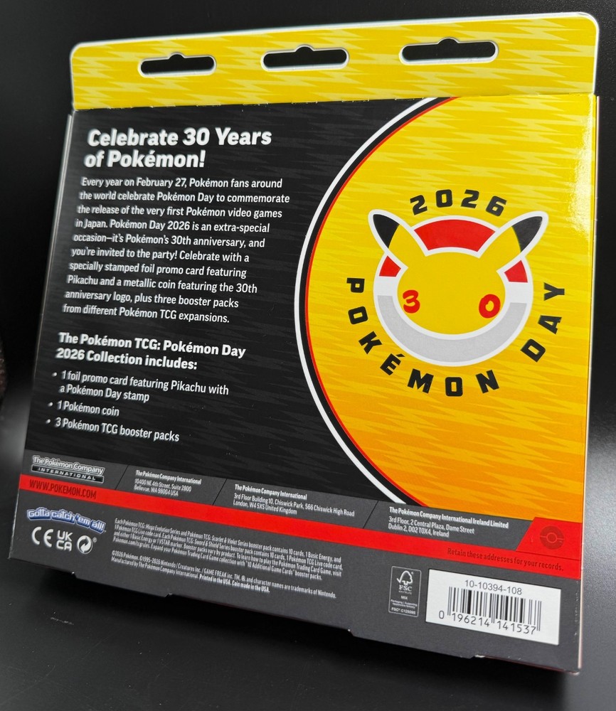 Brand New - Factory Sealed - In Hand & Ready to Ship! Celebrate three decades of Pokémon with this special 30th Anniversary collection! Released exclusively for Pokémon Day 2026, this premium set is a must-have for any serious collector. What's Included: 3 Pokémon TCG Booster Packs - Mix of recent expansions for maximum variety 1 Special Foil Promo Card - Exclusive Pokémon Day 2026 commemorative card 1 Collector's Coin - Limited edition 30th Anniversary design 1 Pokémon TCG Live Code Card - Unlock digital content online Premium Packaging - Special Pokémon Day 2026 themed box Product Highlights: ✨ 30th Anniversary Exclusive - Limited release celebrating Pokémon Day 2026 ✨ Special foil promo card you can't get anywhere else ✨ Collectible anniversary coin - Perfect for display or wearing ✨ 3 booster packs - More packs means more chances for rare pulls! ✨ Premium presentation - Beautiful box design worthy of this milestone celebration ✨ Official Pokémon merchandise ✨ Brand new, factory sealed condition ✨ Ships from Texas - fast and secure shipping! Perfect for long-time Pokémon fans who've been with the franchise since the beginning, collectors of special edition sets, or anyone who wants to commemorate 30 incredible years of Pokémon! This is a piece of history celebrating one of the most beloved franchises in the world. In hand and ready to ship same or next business day! Pack art not shown in photo not guaranteed - varies by box. Interested in particular pack arts? Reach out and we'll see what we can do! Don't miss your chance to own this milestone collection - Pokémon Day releases are always highly collectible!