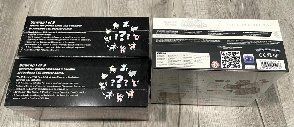 Selling a bundle of Pokémon TCG Prismatic Evolutions products. These items are brand new and factory sealed. You will receive the exact items shown in the photos. You will get: 1 x Prismatic Evolutions Elite Trainer Box (ETB) (this is a normal ETB) 2 x Prismatic Evolutions Surprise Boxes Free shipping via USPS.