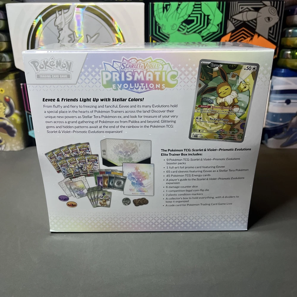 Eevee & Friends Light Up with Stellar Colors! From fluffy and fiery to freezing and fanciful, Eevee and its many Evolutions hold a special place in the hearts of Pokémon Trainers across the land! Discover their unique new powers as Stellar Tera Pokémon ex, and look for treasure of your very own across a grand gathering of Pokémon ex from Paldea and beyond. Glittering gems and hidden patterns await at the end of the rainbow in the Pokémon TCG: Scarlet & Violet—Prismatic Evolutions expansion! . The Pokémon TCG: Scarlet & Violet—Prismatic Evolutions Pokémon Center Elite Trainer Box includes: •9 Pokémon TCG: Scarlet & Violet—Prismatic Evolutions booster packs •Each booster pack contains 10 cards and 1 Basic Energy. Cards vary by pack. 1 full-art foil promo card featuring Eevee • 65 card sleeves • 45 Pokémon TCG Energy cards • A player’s guide to the Scarlet & Violet—Prismatic Evolutions expansion 6 damage-counter dice • 1 competition-legal coin-flip die • 2 plastic condition markers • A box to hold everything, with 4 dividers to keep it organized • A code card for Pokémon Trading Card Game Live
