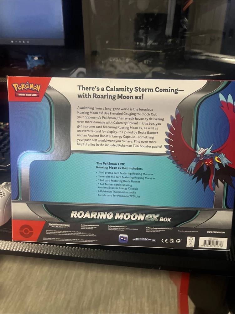 This Pokémon TCG Roaring Moon ex Box is a special edition set from the Scarlet & Violet series, featuring iconic characters like Zapdos, Arceus, and Mimikyu. The box contains 50 English cards, including fan favorites such as Pikachu, Articuno, and Charizard, as well as exclusive full art and extended art cards. Manufactured by Nintendo in 2023, this limited edition box is perfect for collectors and fans of the Pokémon TCG, offering unique artwork and 1st edition cards to add to your collection.