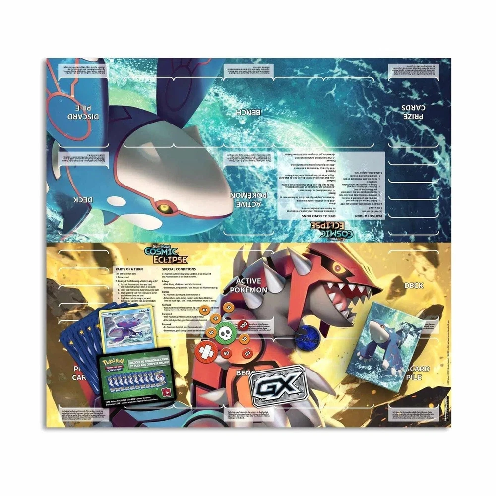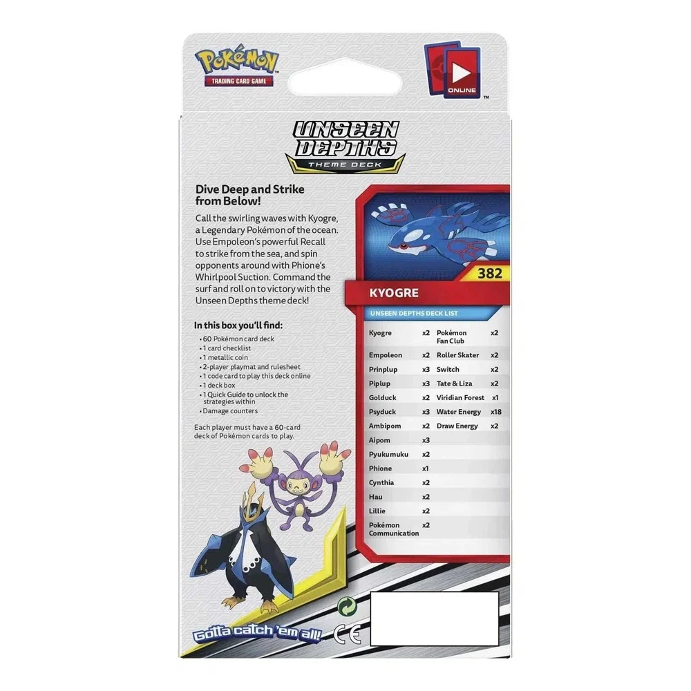 Pokémon TCG [Sun & Moon: Cosmic Eclipse] - Unseen Depths Theme Deck (Kyogre) Condition: New Embark on a winning journey with the Pokémon TCG Sun & Moon—Cosmic Eclipse Unseen Depths Theme Deck! As the final expansion in the Sun and Moon series, Cosmic Eclipse brings you the Unseen Depths Theme Deck featuring the mighty Kyogre. Lead the charge with the exclusive Cracked Ice Holofoil version of Kyogre, making waves as your strategic ace. Inside the deck box, discover a tailored arsenal for victory, including 60 Pokémon cards showcasing the power of water-themed Pokémon. With a lineup curated for aquatic domination, you'll wield Kyogre as your formidable leader, supported by unique cards like Empoleon and Phione. Drown your opponents in a sea of tactics with a carefully crafted deck that ensures you're always making the right waves. The Unseen Depths Theme Deck comes complete with essential accessories for an immersive Pokémon TCG experience. Unfold the 2-player playmat, consult the rulesheet, and utilize the Quick Guide to unlock advanced strategies. Whether you're a seasoned trainer or just starting, the deck also includes a metallic coin, a card checklist, a code card for online play, a deck box for storage, and damage counters. Dive into battles, command the surf, and conquer with Kyogre in this thrilling Pokémon TCG adventure! Browse what else we have in stock - thousands of toys, games, and other fun merchandise from Poggers, the best toy store in the world!