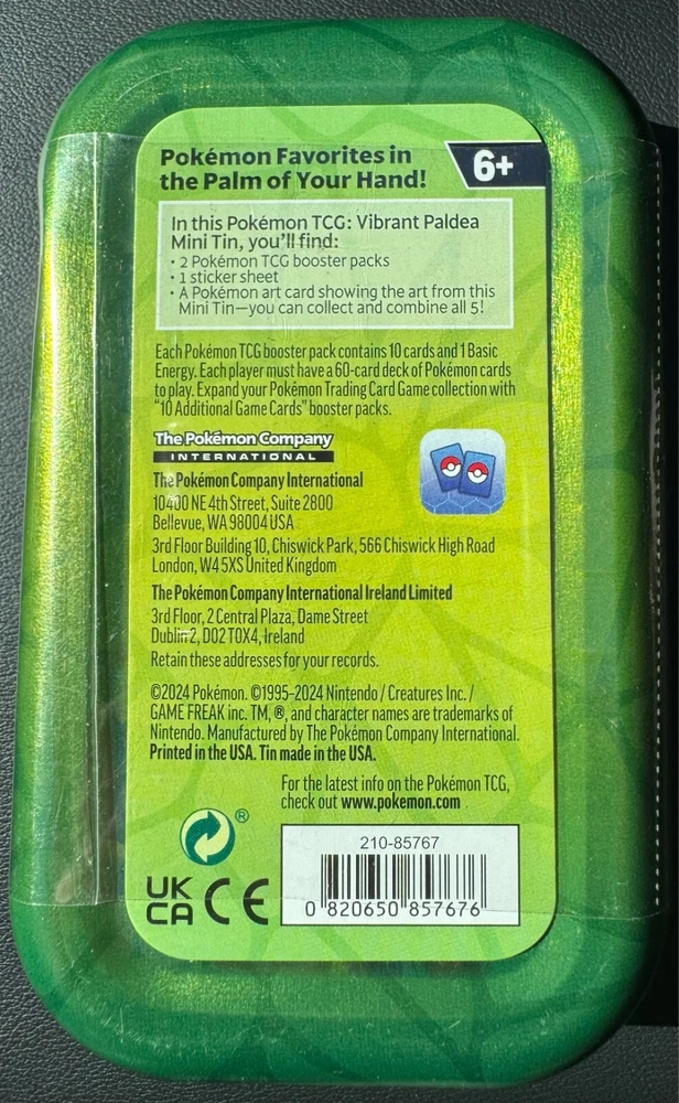 Qty. 1 - Pokemon TCG - Vibrant Paldea Mini Tin - Palafin & Pachirisu Art Features: Factory Sealed 2 Pokémon TCG booster packs 1 sticker sheet A Pokémon art card showing the art from this Mini Tin