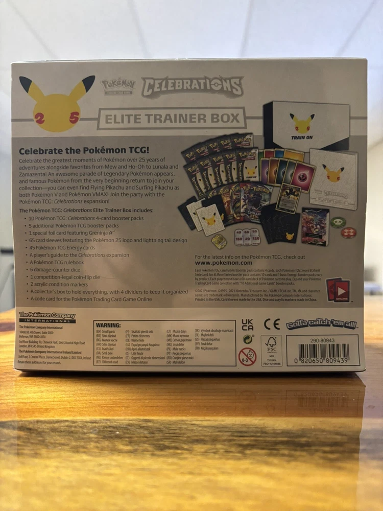The "Pokemon 25th Anniversary Celebrations Elite Trainer Box" is a special set from the Scarlet & Violet series, featuring the character Snorlax. Manufactured in 2023 by Pokémon, it includes booster packs and is made of card stock. This English-language box is perfect for Pokémon TCG fans aged 6 and up, with a Standard card size. It is a limited edition item to celebrate the 25th anniversary of Pokémon.