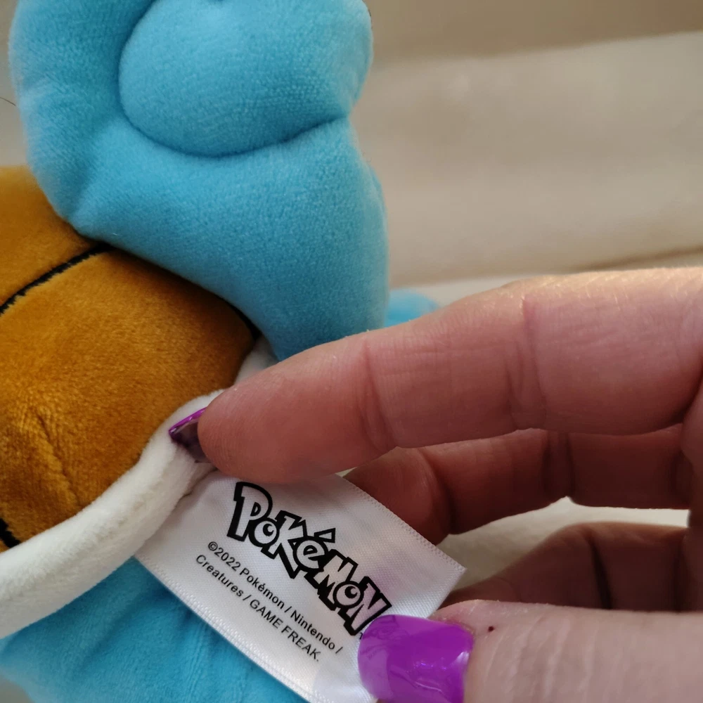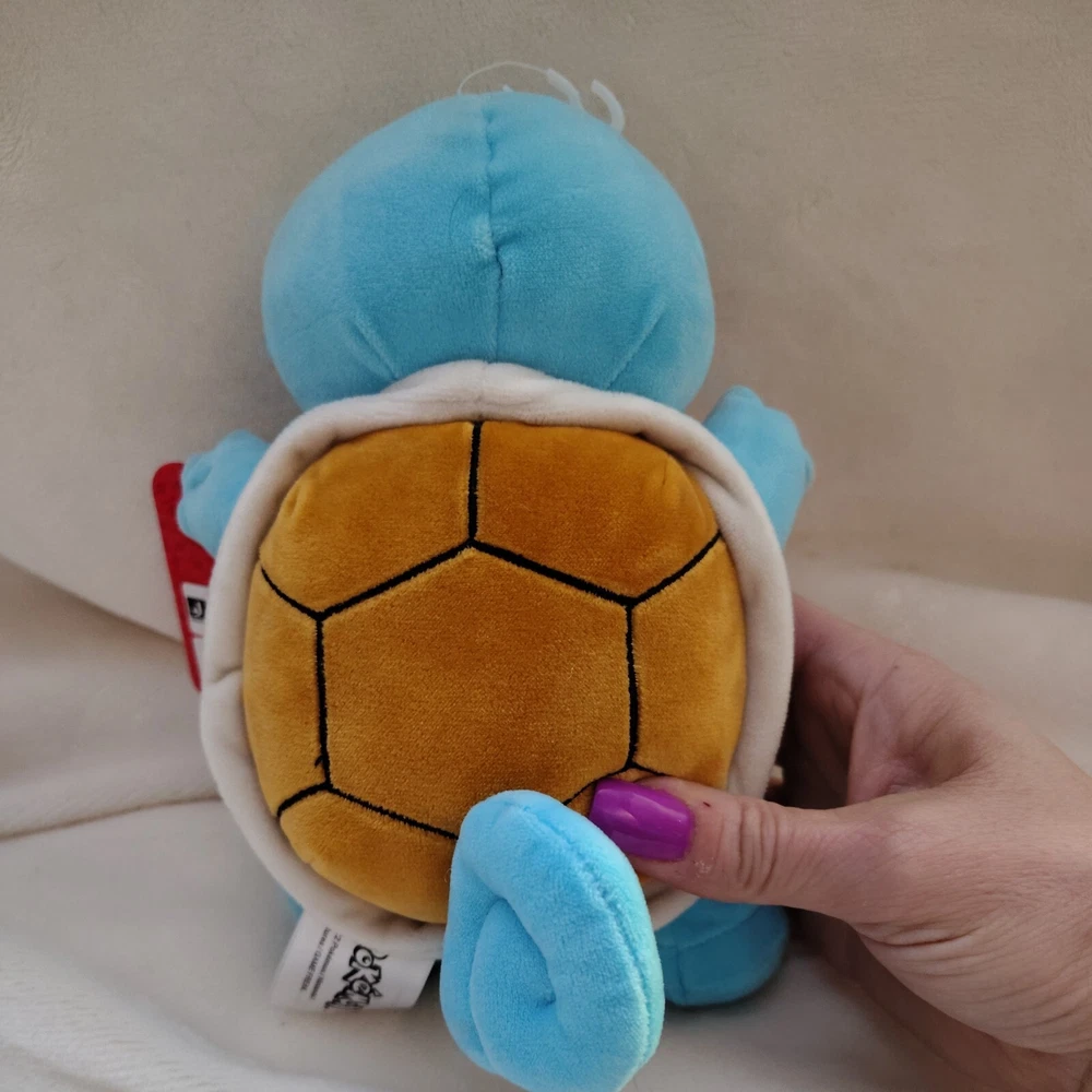 This is an 8" Pokemon Squirtle plush stuffed animal from 2022. The winking turtle is super soft, blue in color, and features embroidered details. It comes with tags and is recommended for ages 2 and up. Manufactured by Jazwares in China, this small-sized toy is part of the Pokemon character family.