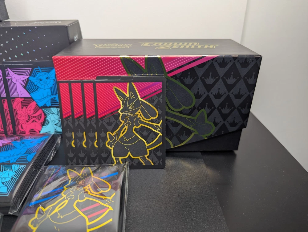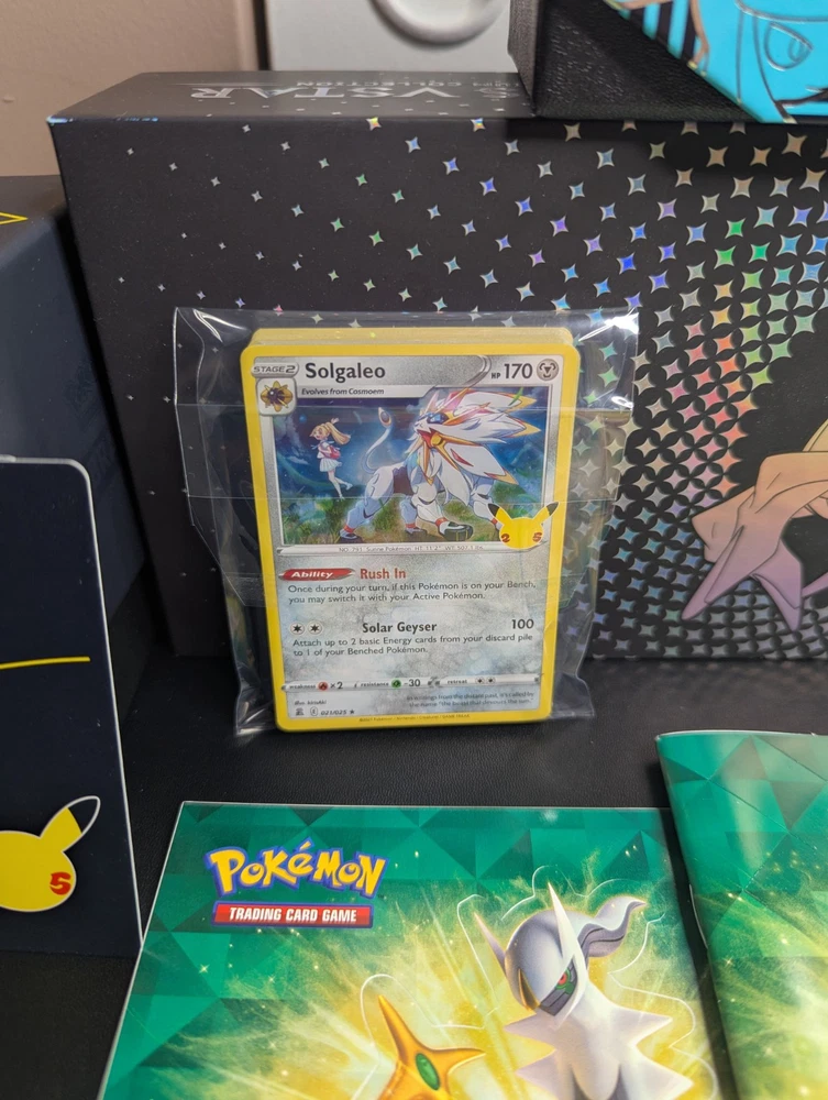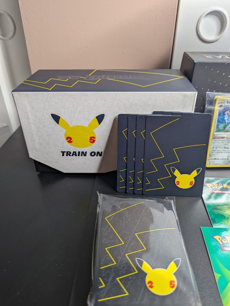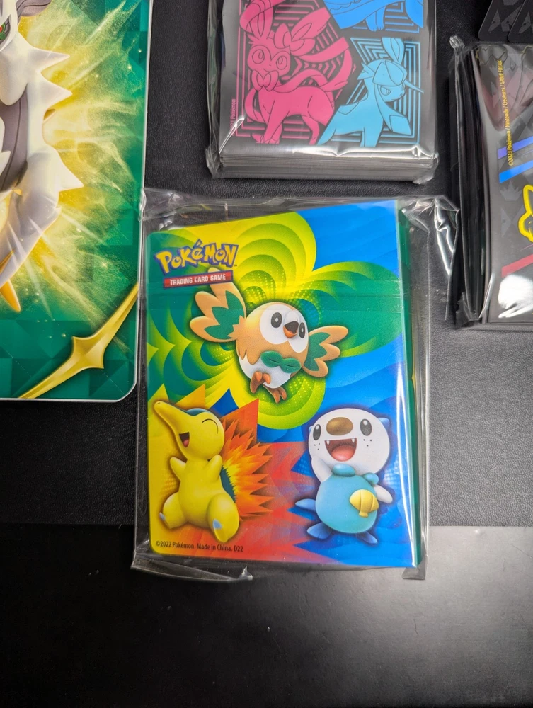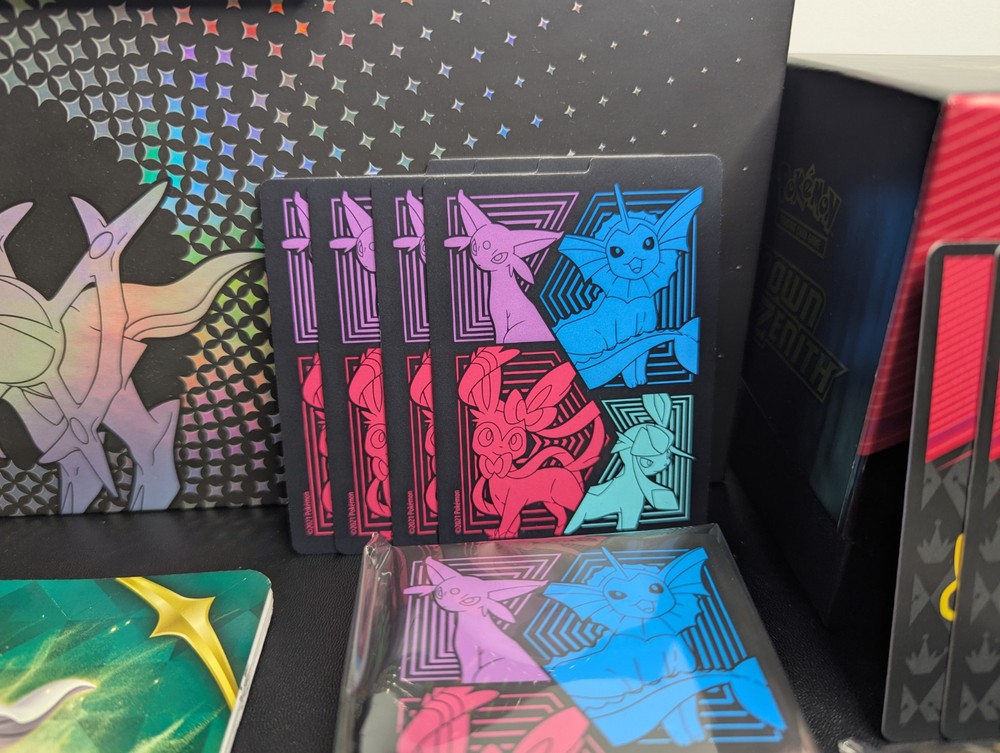 Pokemon Lot of 3 Empty ETB w/ Matching Dividers/Sleeves + Arceus UPC Box + More You will receive everything shown in the first photo. See below: - A total 3 EMPTY Elite Trainer Boxes. - ALL matching dividers (4 per box) and matching sleeves. (Every ETB comes with a matching set of sleeves and dividers.) - (NOT PICTURED) 3 Matching Player's Guide Booklets - EMPTY Arceus UPC box - 2 Sticker Sheets - 1 Arceus Themed Notebook - 1 Mini Portfolio - CELEBRATIONS Holo Bulk ---------------------------------------------------------- Items are in good condition but be sure to review the provided photos for more condition details. ---------------------------------------------------------- This product is a lot of 4 EMPTY ETB boxes from the Pokémon Trading Card Game. The boxes come with matching dividers and sleeves, and come with bonus stickers and other things. You will also get the EMPTY Arceus UPC box. This set is ideal for Pokémon TCG collectors who need storage solutions for their cards, as well as new collectors of all ages! Thanks for looking!
