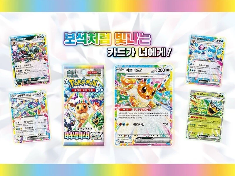 Pokémon TCG - Scarlet & Violet Terastal Festival ex [sv8a] High Class Expansion Set Booster Pack Brand NEW Factory SEALED Korean Version Terastal Festival ex card list contains many sought after rare cards such as the Umbreon ex (Sunbreon), Leafeon ex, Flareon ex, Vaporeon ex, Glaceon ex, Jolteon ex, Espeon ex, Sylveon ex, Eevee ex Full/Alternate Art Special Illustration Rare - Special Art Rare (SAR). As well as Ceruledge ex, Roaring Moon ex, Bloodmoon Ursaluna ex, Terapagos ex Full/Alternate Art Special Illustration Rare - Special Art Rare (SAR). Pikachu ex Hyper Rare - Ultra Rare (UR) for example. Also includes Kieran, Lacey, Crispin, Janine, Drayton, Amarys Full/Alternate Art Special Illustration Rare Trainers. This set is equivalent to the Prismatic Evolutions English set and identical to the Terastal Festival Japanese set DETAILS: Factory Sealed / Brand New Unopened factory sealed packaging x1 Terastal Festival Booster Pack Contains 10 Random Cards / 1 Guaranteed Holo ex Card Each booster pack contains 10 random Pokemon TCG cards Each booster pack is guaranteed to have at least 1 ex holo card Cards are random as factory sealed. No guarantees for a specific card. This listing is for x1 booster pack. Please check the quantity of the items before purchasing if you wish to purchase more! Ships within 1-3 working days.