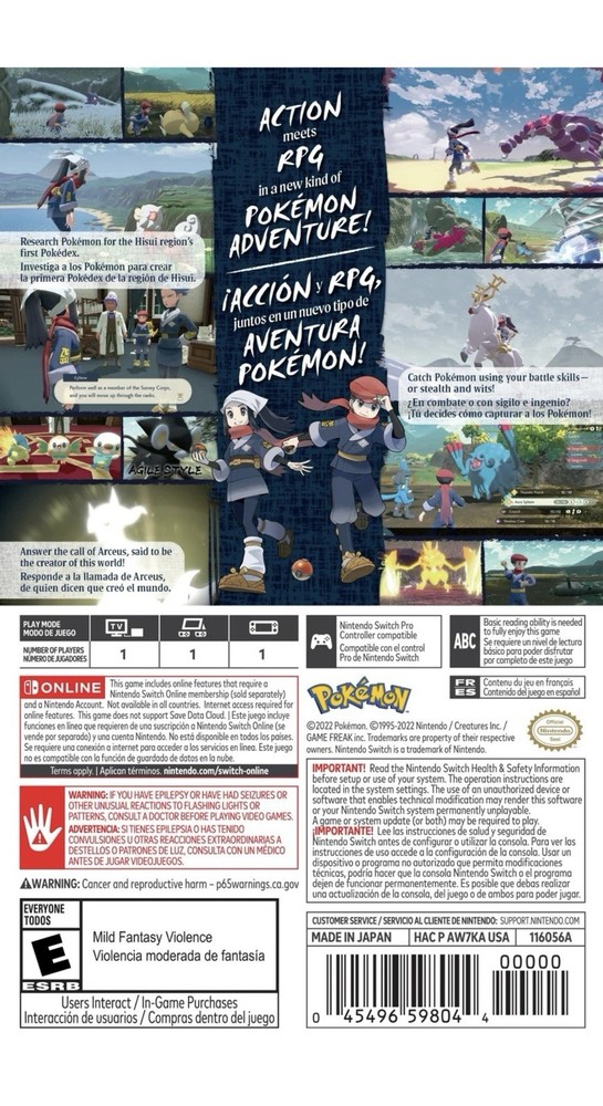 Pokemon Legends: Arceus for Nintendo Switch is a highly anticipated game published by Nintendo Games. With a rating of E10+ (Everyone 10+), this single-disc game offers a mix of battle, role-playing, and action & adventure genres. Released in 2022 in the NTSC-U/C (US/Canada) region, this factory-sealed game is sure to provide hours of entertainment for fans of the Pokemon franchise.