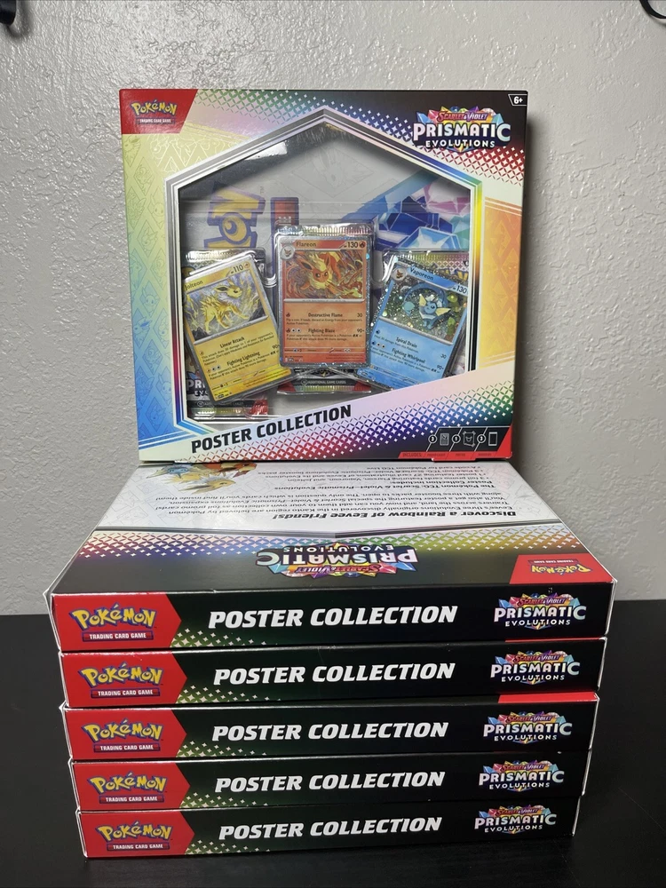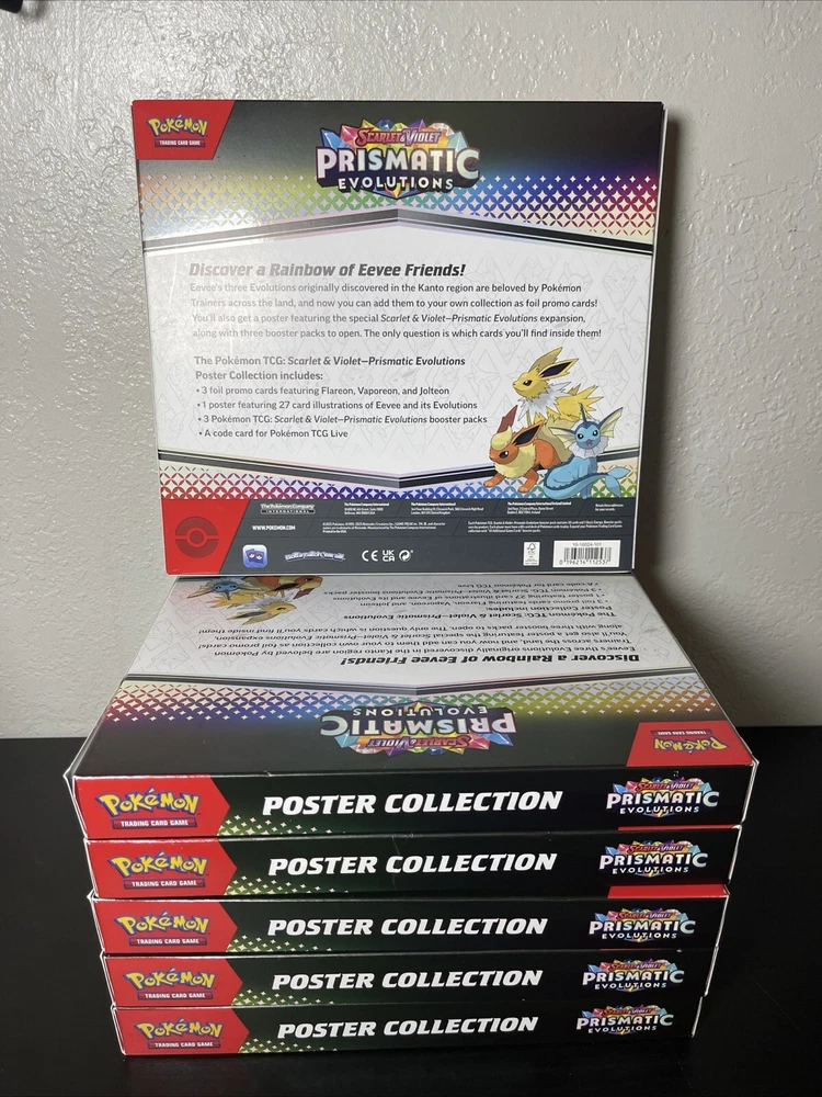 Elevate your Pokémon collection with the Pokemon Prismatic Evolutions Poster Collection, a factory-sealed lot of 5 boxes, Factory sealed No refunds