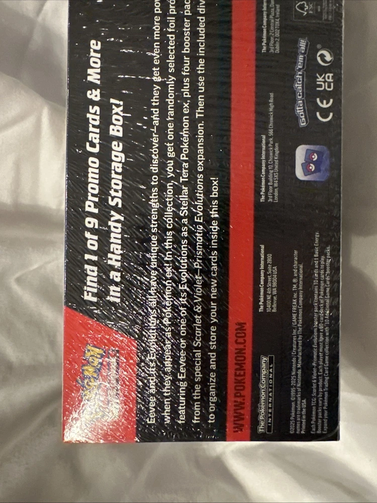 The Pokemon Prismatic Evolutions Surprise Box is a sealed box set featuring the character Eevee from the Pokemon TCG. Manufactured in the United States in 2025, this exclusive edition box contains special cards and features related to the evolution theme. With a display configuration and English language content, this collectible card game item is perfect for collectors and fans of the Pokemon franchise looking for new and exciting cards to add to their collection.