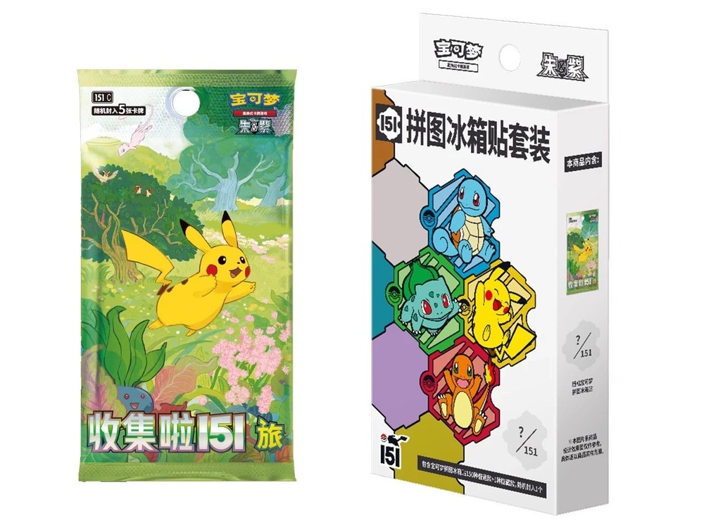 Nintendo Official Pokemon Chinese Products: the "Collect 'Em All 151 Puzzle Fridge Magnet Set" . This set includes one random Pokémon puzzle fridge magnet (out of a total of 151 designs, with one being a secret version) and one "Collect 'Em All 151 Journey" booster pack containing five cards. The fridge magnets are made of metal material , with each design corresponding to one of the 151 Pokémon (Pokédex No. 001-151) . The background colors are themed according to nine different attributes : Grass, Fire, Water, Electric, Psychic, Fighting, Dark, Colorless, and Dragon—creating a vibrant and colorful collection. Since all magnets share a similar shape and feature interlocking edges , trainers can freely mix and match different designs, assembling them like a puzzle to create their own personalized Pokémon fridge magnet wall . In addition to the fridge magnet, the gift box also includes one "Collect 'Em All 151 Journey" booster pack containing five cards. 100% Nintendo authentic pokemon products ! Please note this is Chinese Version ! Chinese Pokemon Card has blue back like English version. 100% authentic nintendo products, made in Japan, released in China Mainland.