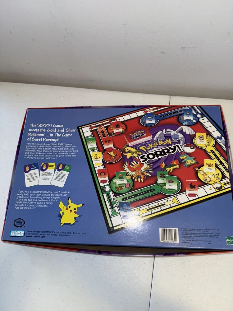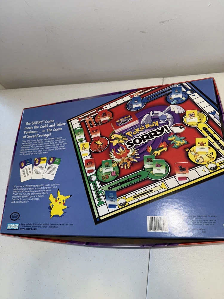 Game Title:Sorry!Type:Game Boardgtin13:76930414644Brand:HasbroAge Level:4-7, 8-11 Years, 12-16 Years, 17 Years & UpRecommended Age Range:6 and UpYear:2001Theme:Movie & TVCharacter Family:PokemonUPC:76930414644Color:RedGender:Boys & GirlsMin. Number of Players:2 playersGame Type:Board Game