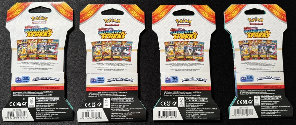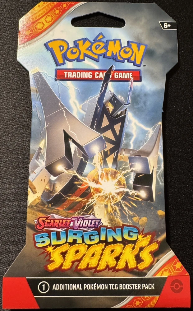 The "Pokemon Scarlet & Violet Surging Sparks Sealed Booster Pack" lot includes 4 packs from the set, each containing 10 cards for a total of 40 cards. These English language packs are from the Pokémon TCG series, manufactured by Pokemon for players aged 8 and above. The standard-sized cards are part of the 2024 release, providing collectors and players with new cards to enhance their gameplay experience. Each pack offers a chance to discover exciting new cards to add to your collection or decks. Each lot of 4 will contain one pack with each of the 4 Surging Sparks mascot Pokémon as shown in the images.