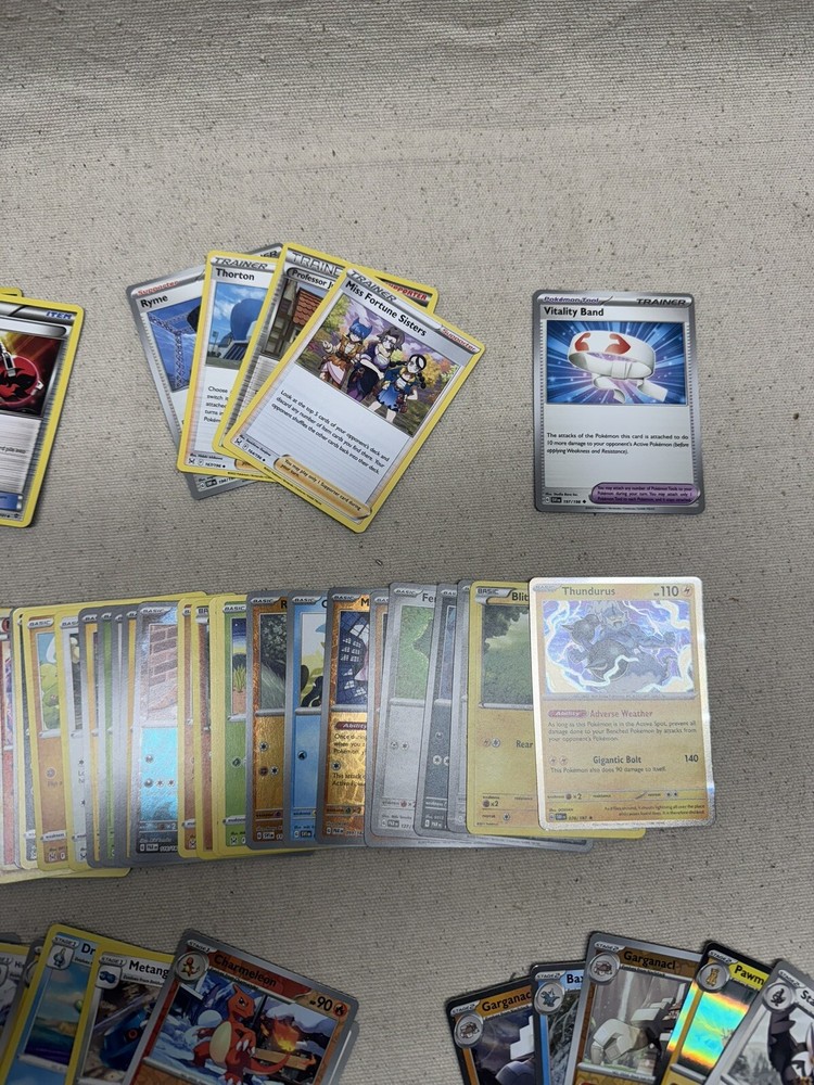 This product is an assortment of Pokémon trading cards that includes various types of cards from random collections, along with 3 coins. The cards are printed in English and manufactured by Nintendo, specifically for the Pokémon Trading Card Game. This collection would be a great addition for fans of the Pokémon TCG looking to expand their card collection with a variety of cards and some collectible coins to enhance their gameplay experience. Here's the breakdown of the types of cards: 30 Basic characters 14 Stage 1 characters 5 stage 2 characters 7 Basic energy 3 Regular energy 2 Special energy 9 Trainer/Item 4 Trainer/Supporter 1 Trainer/Pokemon tool