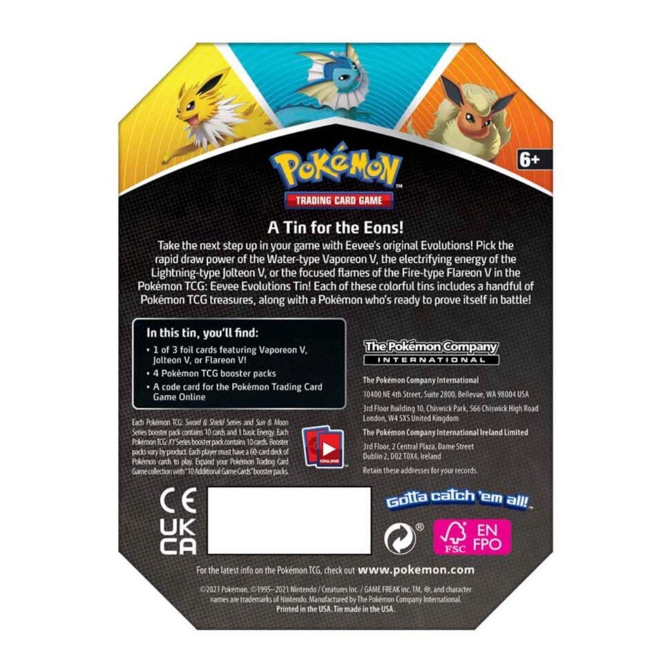 Your Pokémon Trading Card Game collection is about to level up with Eevee's original Evolutions. The new Eevee Evolutions Tins feature the Water-type Vaporeon V, whose Triple Draw attack can quickly get cards into your hand and whose Splash Jump will damage your opponent's Pokémon while allowing you to swamp in another Pokémon from your Bench. There's also the electrifying energy of the Lighting-type Jolteon V, with its Pin Missile attack that is capable of causing up to 240 damage. The third tin includes the Fire-type Flareon V, whose Scorching Column attack not only does damage, but leaves its target Burned. In addition to these incredible (and adorable) Pokémon V, each colorful tin also includes four Pokémon TCG booster packs to bolster your deck. 1 of 3 foil cards featuring Vaporeon V, Jolteon V, or Flareon V 4 Pokémon TCG booster packs A code card for the Pokémon Trading Card Game Online THANK YOU FOR YOUR BUSINESS