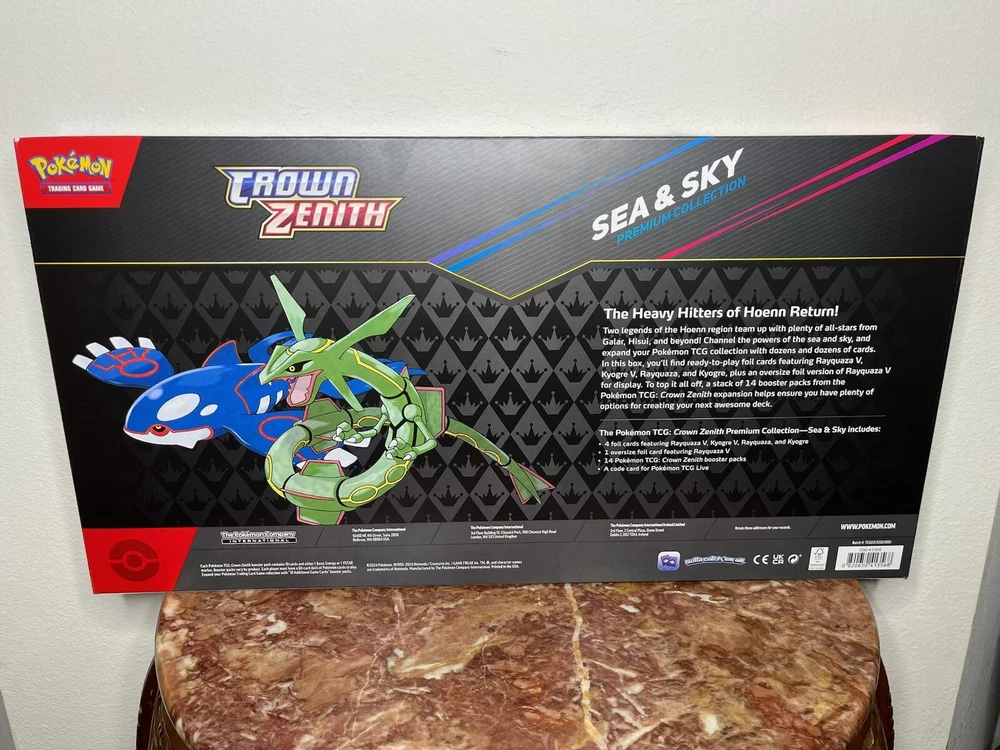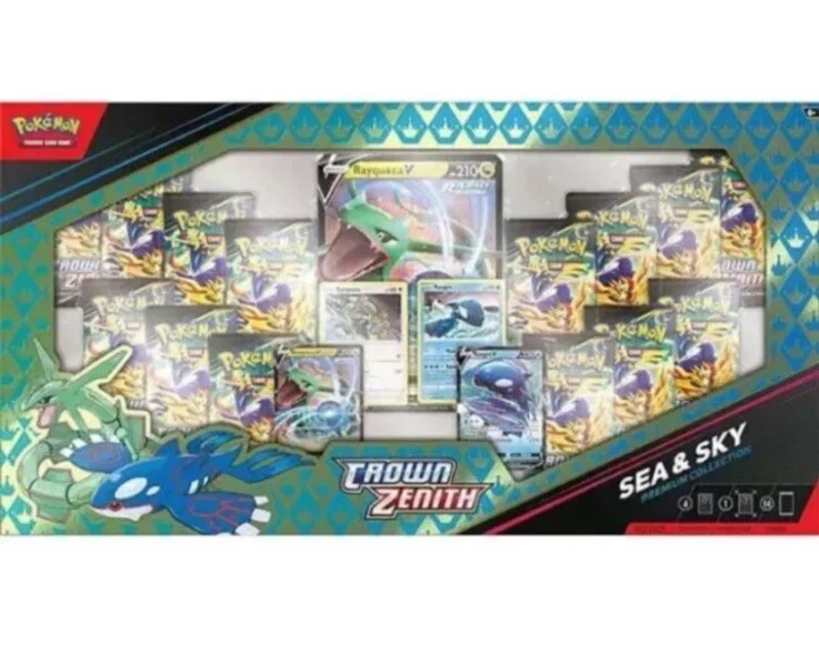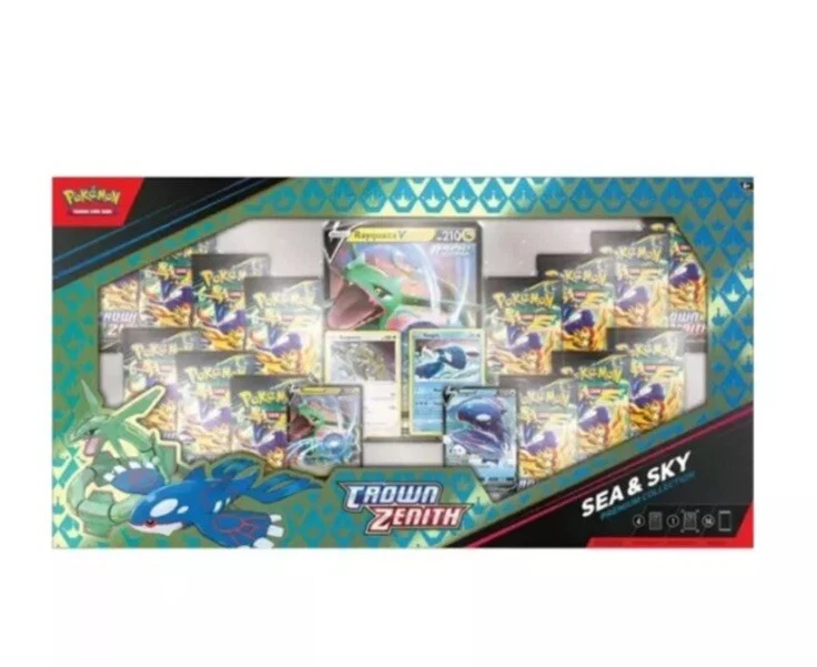 Elevate your Pokรฉmon TCG collection with the Crown Zenith Sea and Sky Premium Collection Box, a must-have for enthusiasts and competitive players alike. This exclusive set features iconic characters Kyogre and Rayquaza, plus a special Box promo card that's sure to stand out in any display or deck. The English language, standard-sized cards come housed in a single box, ready to add a touch of brilliance to your game. All items are 100% Authentic Guaranteed. No Returns - Final Sale.