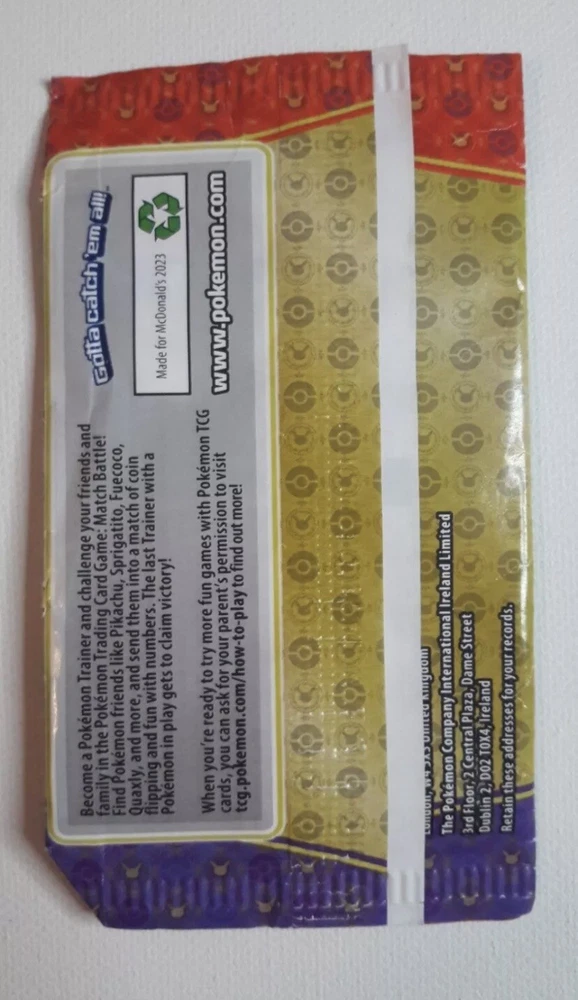 This is a lot of 12 packs of Pokémon TCG McDonald's 2023 Build & Battle. Each pack contains 4 cards, including 1 promo card and 3 booster cards. The cards are made of high-quality card stock and are in English language. The lot includes 12 packs, all of which are new and sealed. If you have any questions or concerns please feel free to contact us!