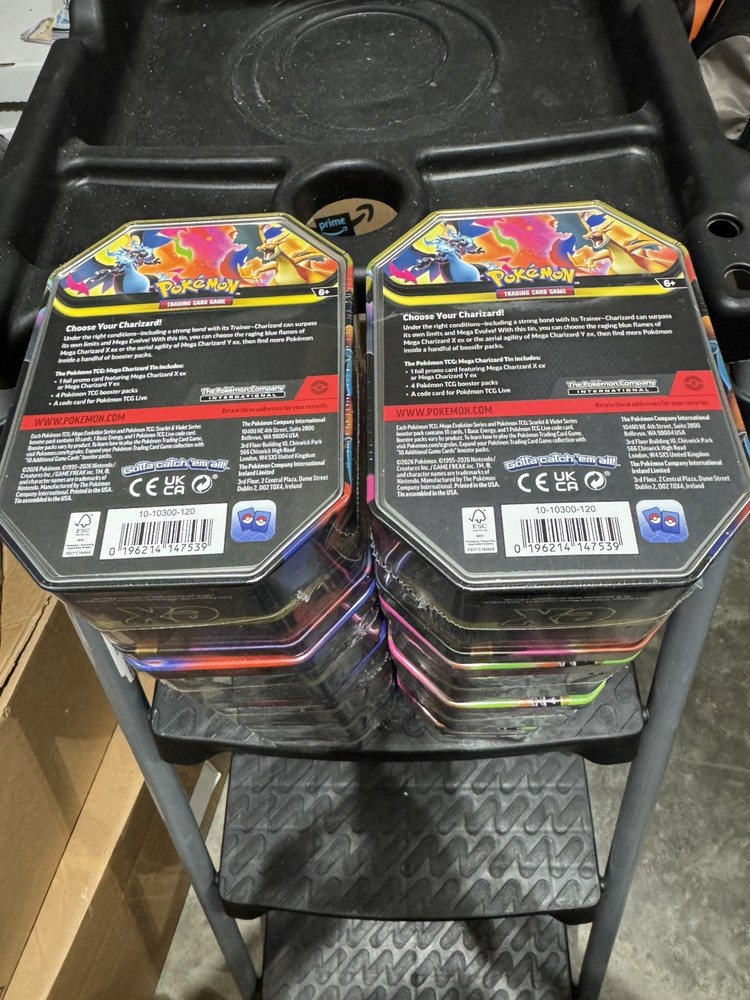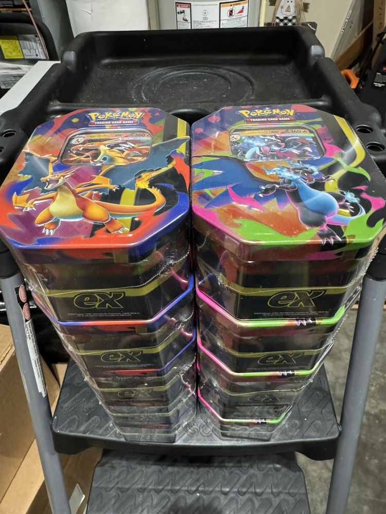 The product is a lot of 10 sealed Mega Charizard X and Mega Charizard Y tins from the Pokémon TCG set "Phantasmal Flames." Each tin contains a total of 82 cards, divided into 2 boxes. The cards are standard size and made of card stock, featuring the Charizard character illustrated by 5ban Graphics. These tins are from the 2026 release and are in English, making them suitable for Pokémon fans aged 6 and up. Additionally, the boxes include Promo cards and are part of the Pokémon League event. You will receive: 5 mega charizard X tins 5 mega charizard Y tins